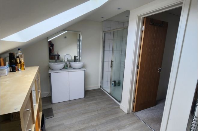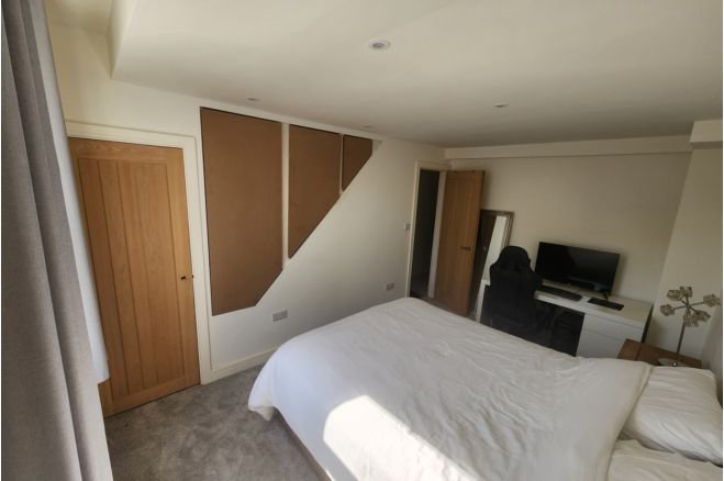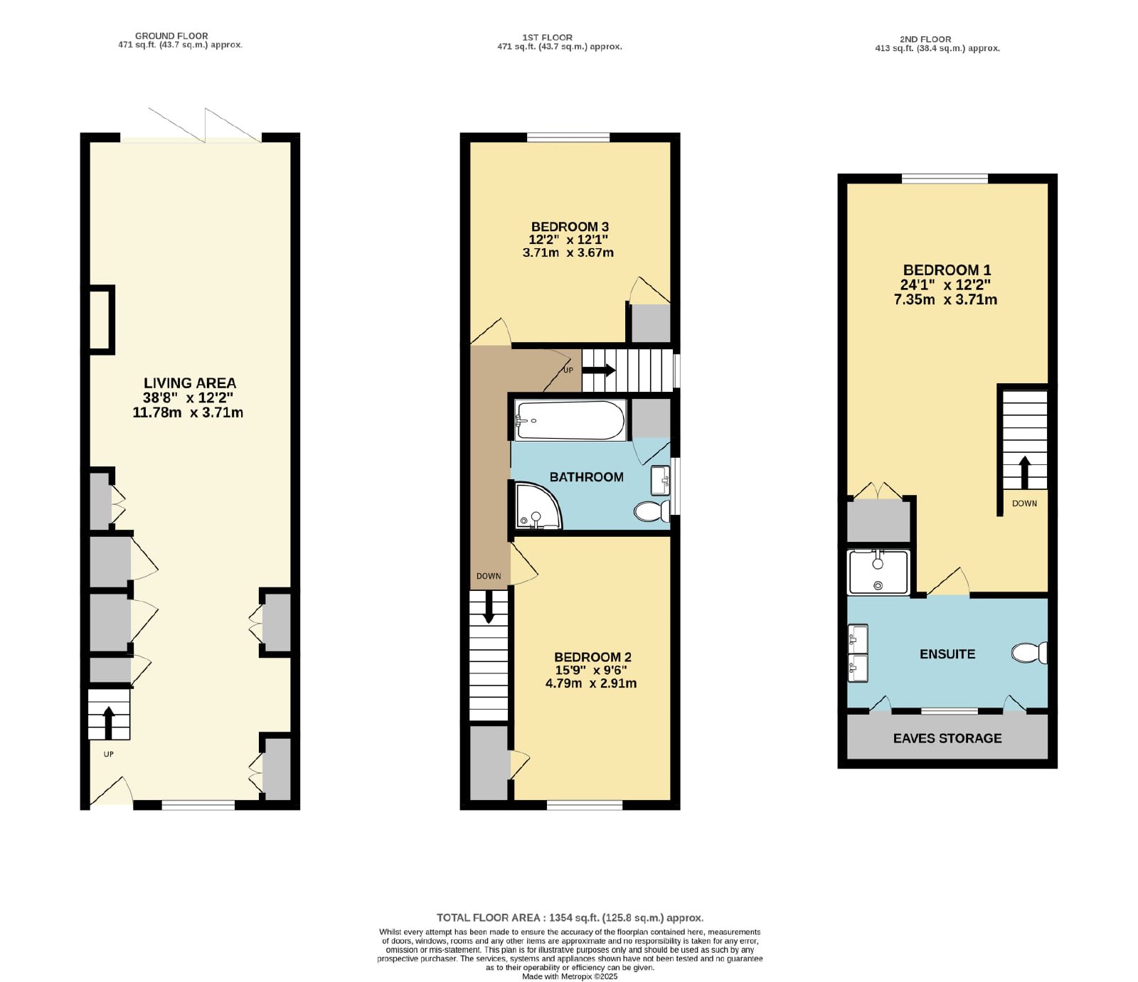A beautifully extended semi‑detached family home offering deceptively spacious living across three storeys. Ground floor: A welcoming entrance hall leads into an exceptional 38′8″ open‑plan living space with contemporary kitchen, dining, and sitting spaces – perfect for modern family life and entertaining. First floor: Two generous bedrooms—Bedroom 2 measuring approx 15′9″ × 9′6″ (4.79 × 2.91 m), and Bedroom 3 approx 12′2″ × 12′1″ (3.71 × 3.67 m)—with a stylish family bathroom upstairs. Second floor: A stunning Principal Bedroom (Bedroom 1) of approx 24′1″ × 12′2″ (7.35 × 3.71 m), complete with a luxurious en‑suite bathroom and useful eaves storage. Outside the rear garden has been designed for ease of maintenance, arranged with tiered decked seating areas and a large garden store/shed.