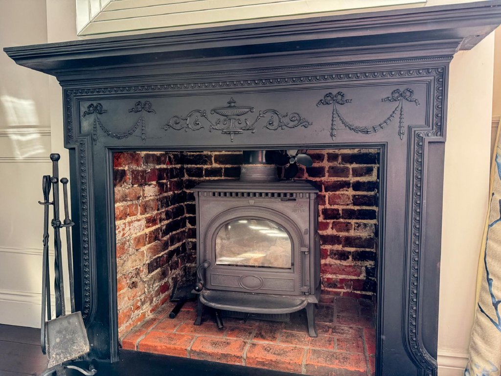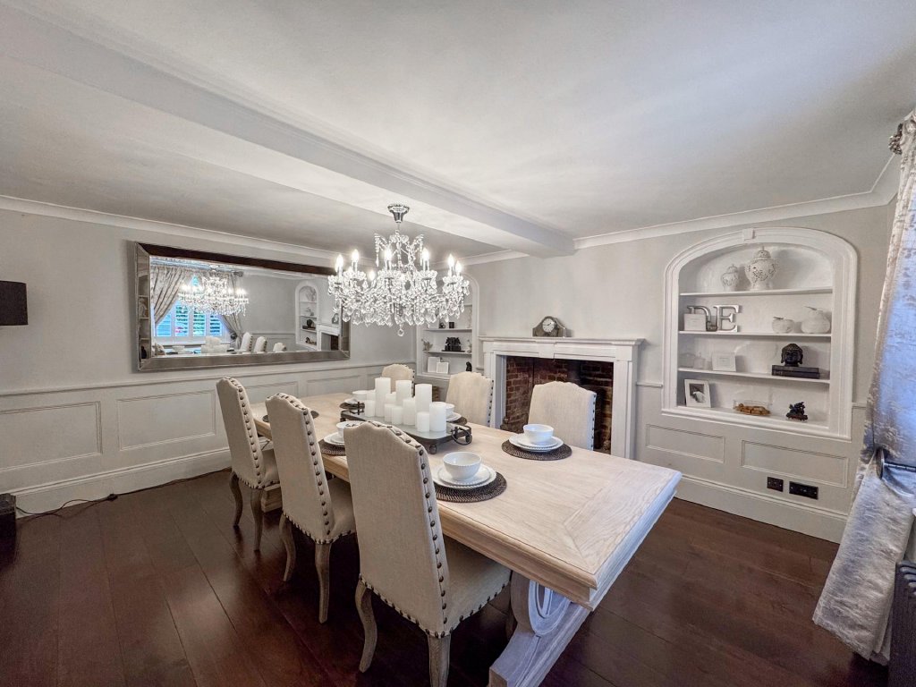 STEP INSIDE This distinguished double-fronted Grade II Listed home unfolds across three thoughtfully arranged floors, offering a harmonious blend of character and contemporary living. Upon entry, a welcoming entrance hall leads to a refined living room, complete with a fireplace and wood-burning stove-an ideal space for both entertaining and relaxation. The dining room exudes sophistication, showcasing original features including a fireplace and inset cupboards.