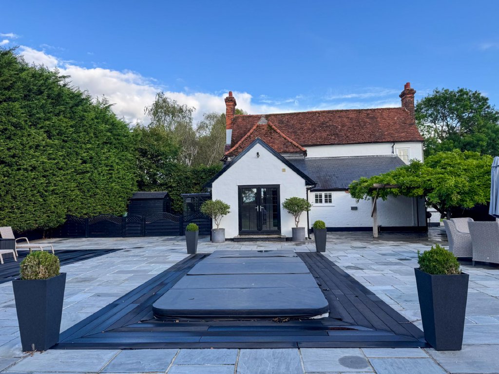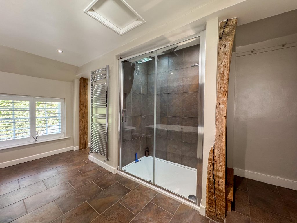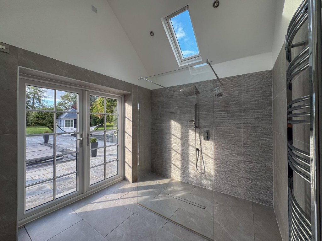 A modern and stylish wet room offers direct access to the garden and swimming pool, enhancing the home's lifestyle appeal.