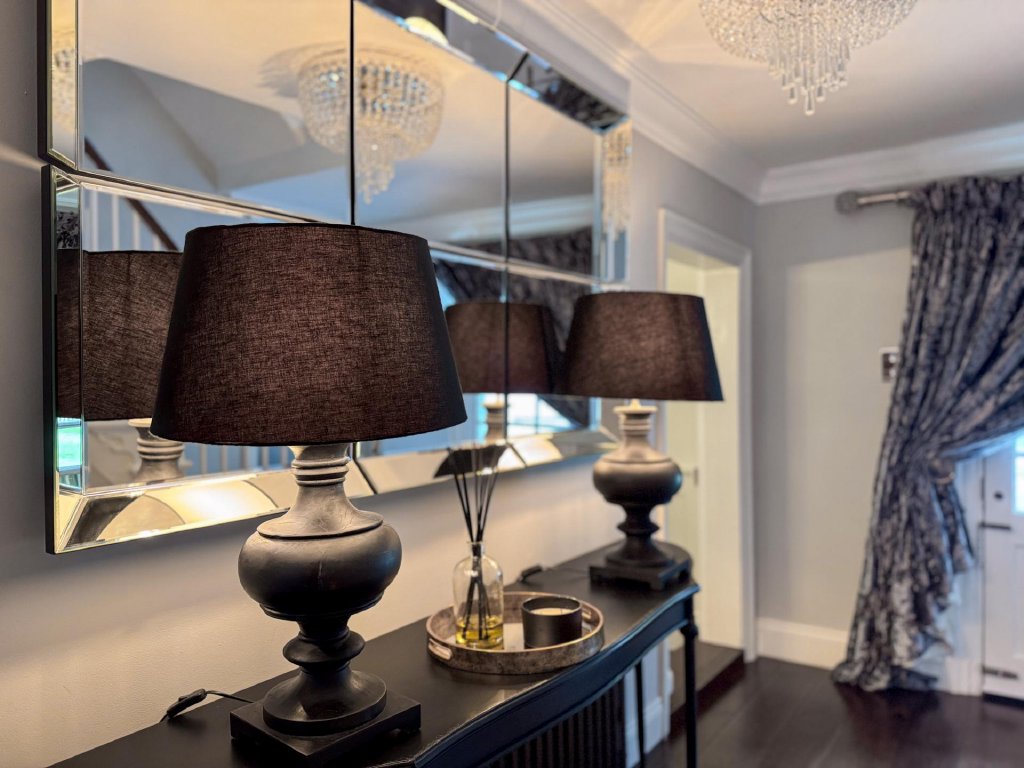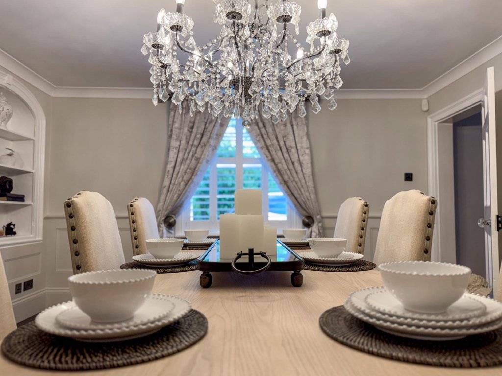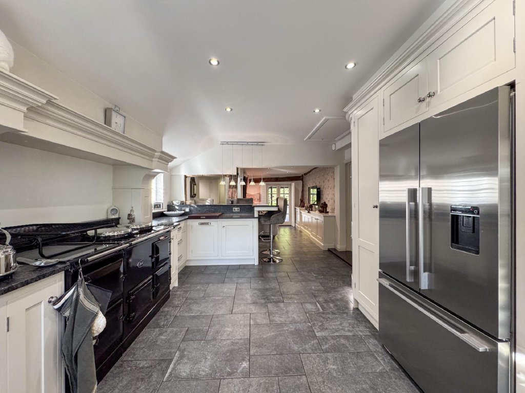 The country-style kitchen and breakfast area has been designed with both practicality and elegance in mind, seamlessly connecting to a well-equipped utility room and a discreet WC. A cosy family room, accessed from the kitchen, provides an intimate retreat, with French doors opening onto the garden.