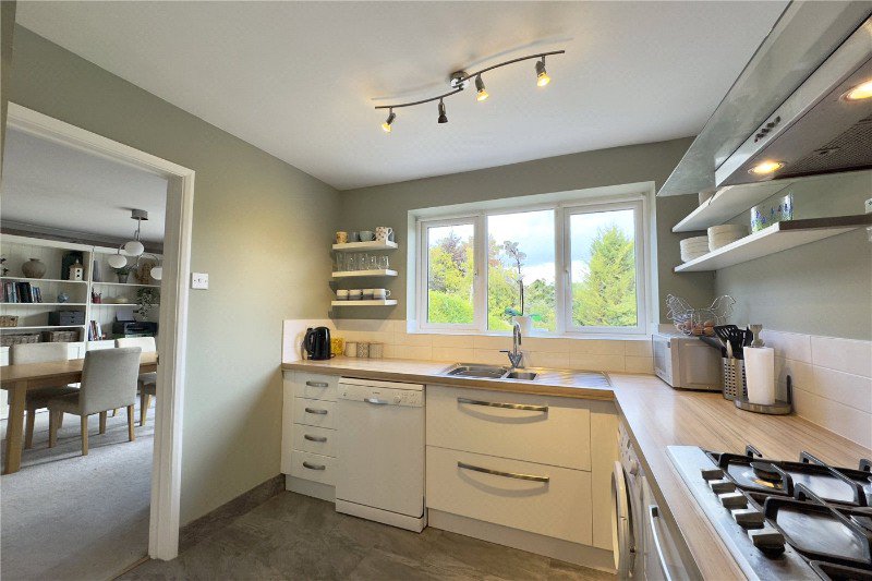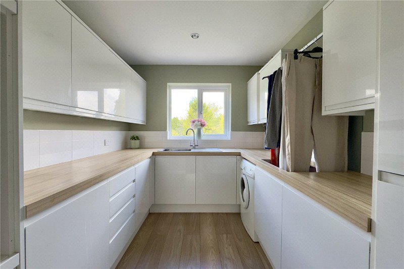 The modern kitchen is fitted with a sleek range of white wall and base units, complemented by wooden worktops and an inset sink overlooking the rear garden. Integrated appliances add to the contemporary finish.