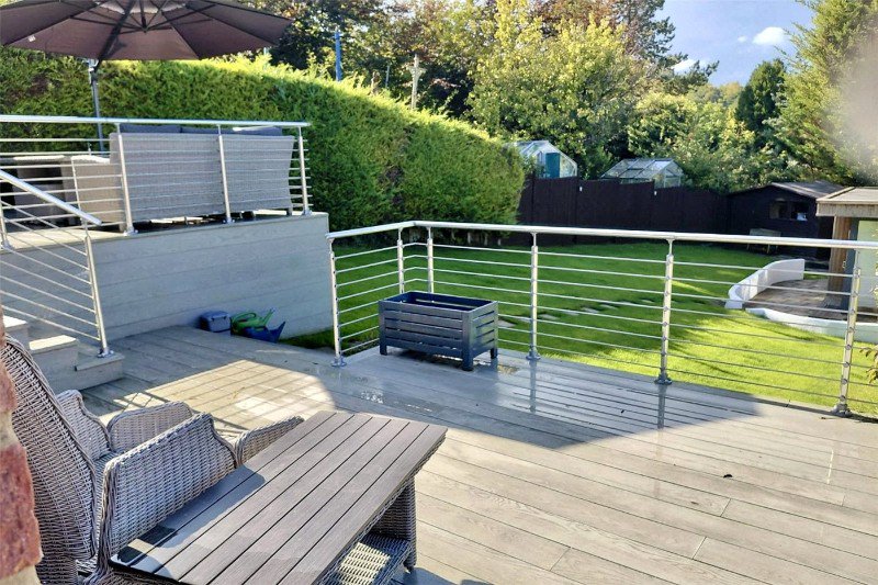 The rear garden features a large, two-level decked terrace with railings and views down to a lawned area bordered by mature hedging and fencing for privacy. At the rear of the garden is a detached home office with power and lighting, ideal for remote work, as well as two storage sheds.
