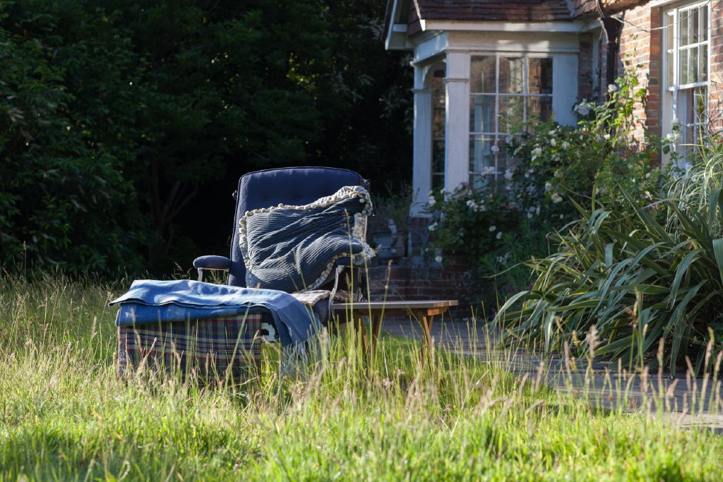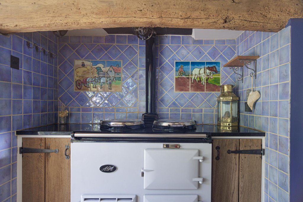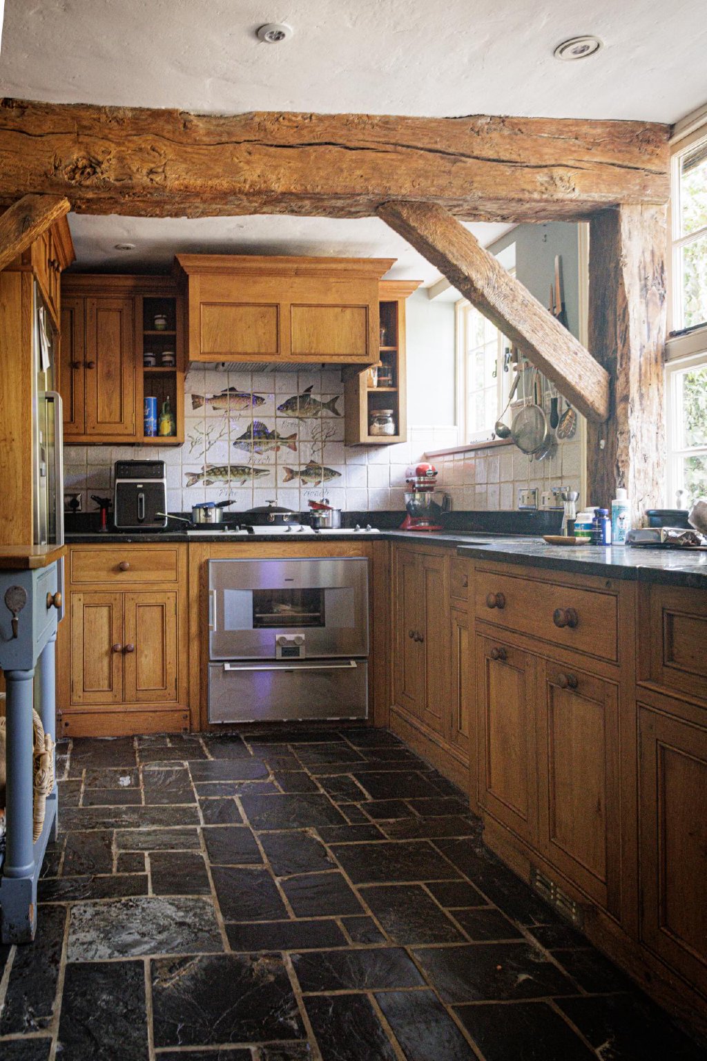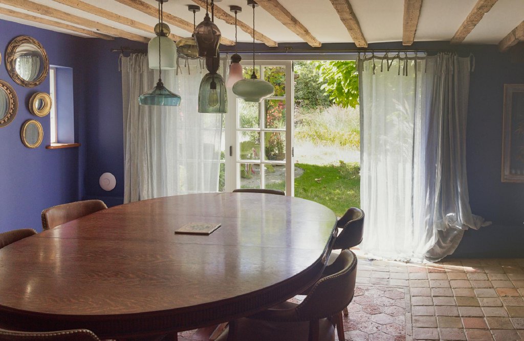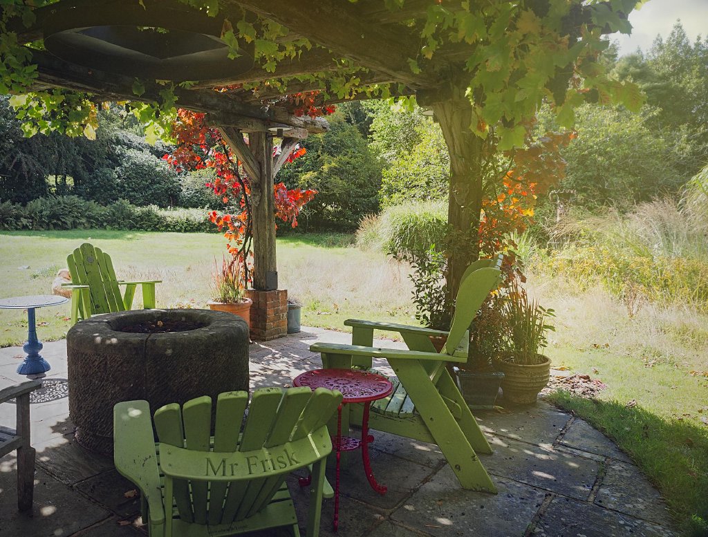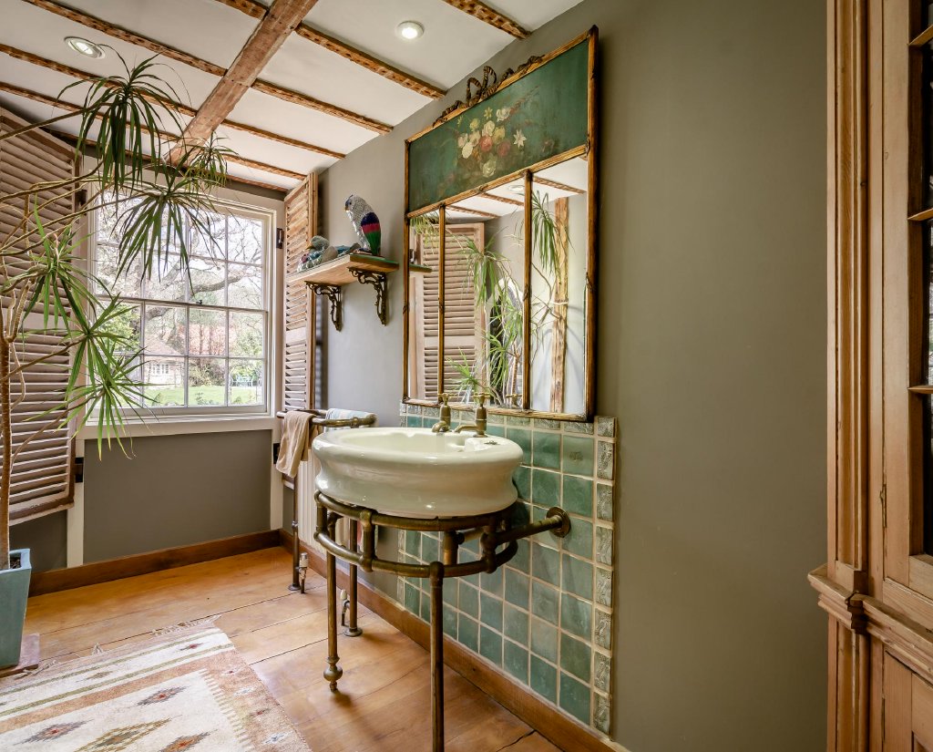 The charm and character of the property continue externally, where the 18th-century façade offers high chimneys, multi-pane bay and sash windows, together with more contemporary aspects. The property is approached via a quiet, leafy country lane, just beyond the small village of Buxted. A wide gravel drive leads up to the York stone entrance, flanked by antique lead cherubs perched upon stone pillars. The gentle arch of the porch is covered with a meandering pink clematis in springtime. The front door leads to a welcoming reception hall with original flagstone floor, a cloakroom, and double doors opening up to a comfortable and intimate living space. The focal point of this room is a large walk-in inglenook fireplace which dominates one wall. The original alcove seating provides a cosy retreat on cold evenings. Direct door access leads to the rustic yet well-proportioned dining room. Originally used as a kitchen (as evidenced by the butler’s bell board, now removed), the room still has the inset chimney where a new Aga now sits, radiating warmth and comfort around the house. A staircase leads up to the master bedroom. There are large built-in cupboards and Fired Earth tiling, together with floor uplighting. Bi-fold doors lead out into the garden. Here you will find a welcoming seating area surrounding a gas-fed fire pit. A pergola covered with grape vines provides shade in summer and a beautiful canopy of fiery red leaves in autumn.