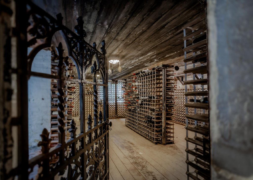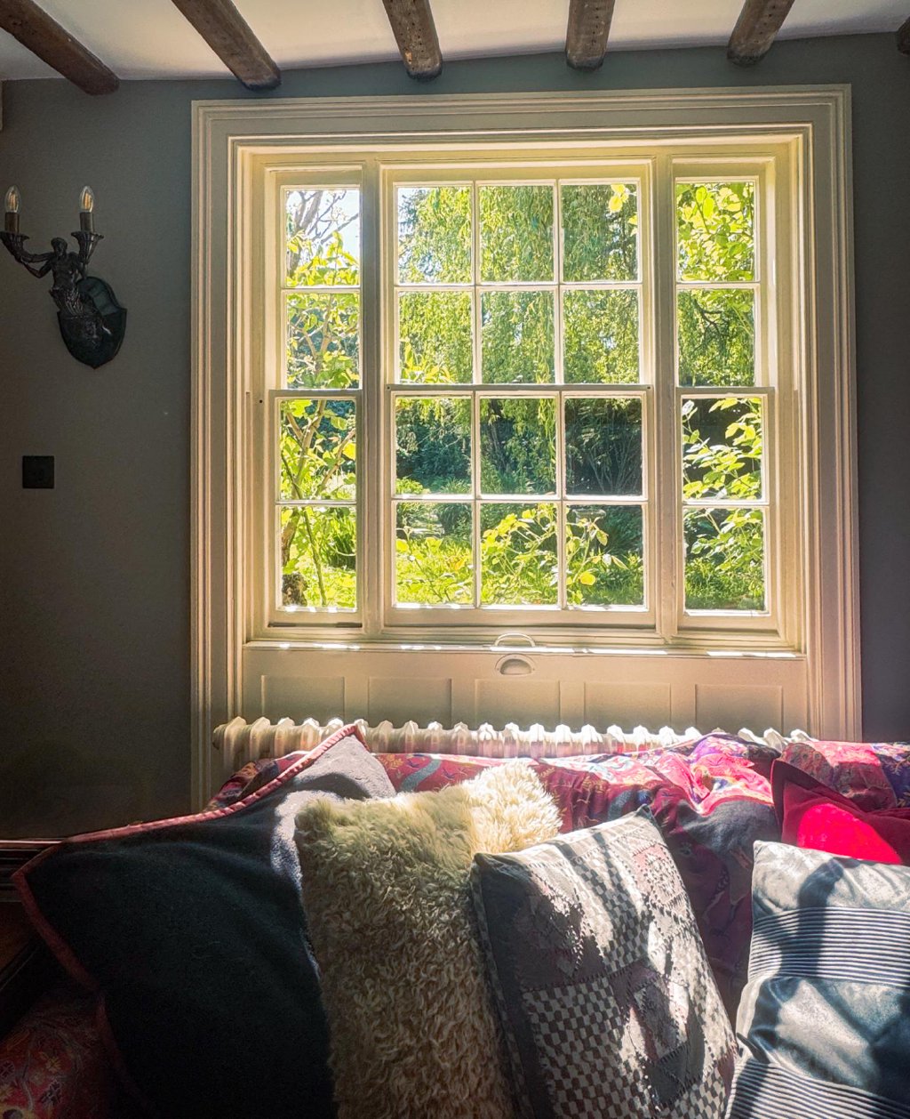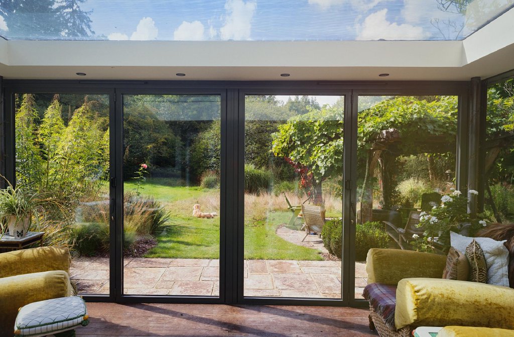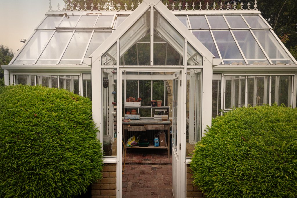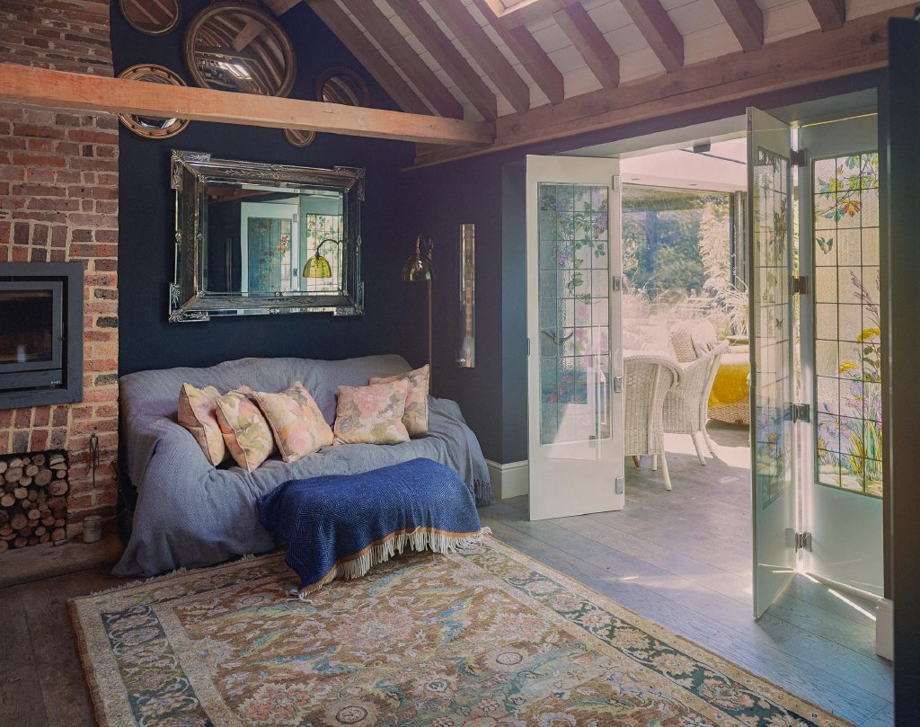 The nearby Catalpa tree, with its huge lime-green handkerchief-type leaves, casts a soft green light over everything in early summer. The dining room leads into a hand built wooden kitchen with slate flooring, granite worktops, and a striking oak support beam. A Miele induction hob and oven, together with other high end appliances, are perfectly placed in a golden triangle to maximise workflow and efficiency. Below ground and leading off from the entrance hall is the storied wine cellar a time-worn and dimly lit space which retains the perfect temperature for wine storage. Beyond the entrance hall, a spacious dual-aspect office/snug provides a tranquil area to work from home. The generous bay window frames a picturesque view of the trees and the lake. The adjacent drawing room, with its high ceilings and large windows, is currently given over to an artist’s studio. It is flooded with soft north light, which gently illuminates the space throughout the day. The modern Morsø multi-fuel burner keeps the room warm in winter. It sits alongside a purpose-built library with wooden panelling, shelves, and ceiling roses. The main Georgian staircase leads from the library to the first floor. At the south end of the property, a converted outhouse is now a stunning family room. It offers a high, vaulted, beamed ceiling, an elevated brick chimney breast with a log burner, and antique French stained glass bi-fold doors leading to a contemporary L-shaped conservatory. Designed to be used all year round, this space features a sweeping single-pane glass roof and floor-to ceiling glass bi-fold doors.