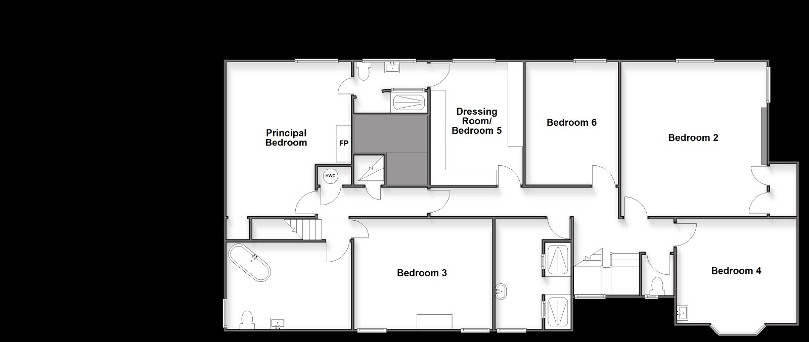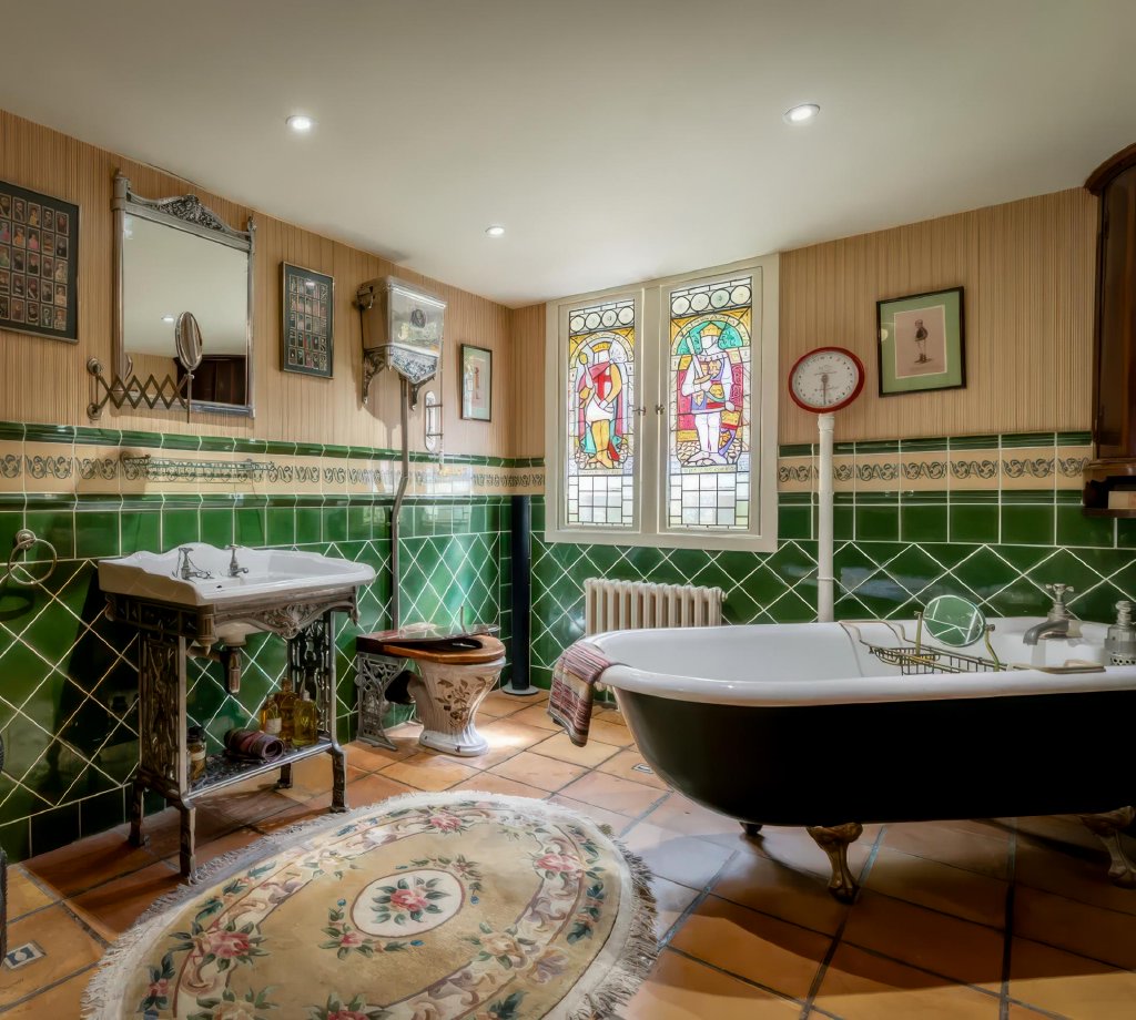 The room opens out onto the York stone terrace and, with all the doors thrown open, it seamlessly connects the interior to the garden. On the first floor, there are five double bedrooms, all with delightful views across the property and beyond. The principal bedroom is a calm and cosy oasis with a beamed ceiling and a Victorian fireplace. The master bedroom has an en-suite shower room leading to a large bespoke dressing room (historically the sixth bedroom). It faces southwest with views over the surrounding countryside. Alongside sits an elegant family bathroom with Fired Earth terracotta floor tiles, a Chadder and Co. clawfoot bath, and an original Victorian toilet. Stained glass shutters on the windows offer privacy when needed. All the bedrooms have their own individual character; one has a vaulted ceiling, cross beams, and a bay window, another is dual aspect with exposed beams, and one is currently in use as a well-equipped gym. Another flight of stairs leads up to a large attic area—an additional office space, ideal if you want to work undisturbed by other activities in the house.