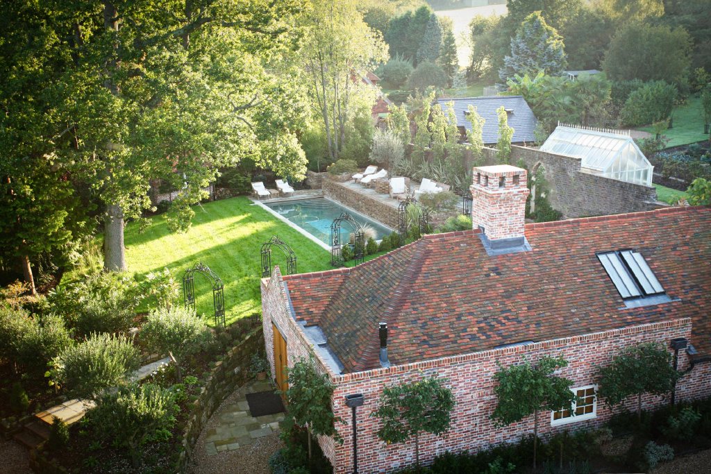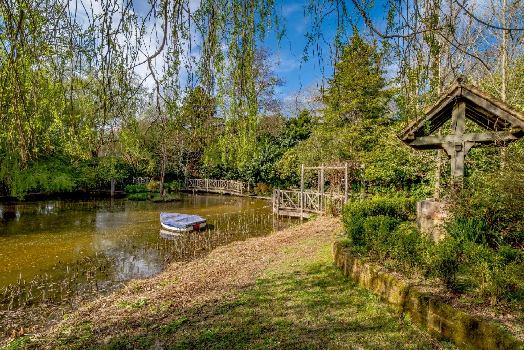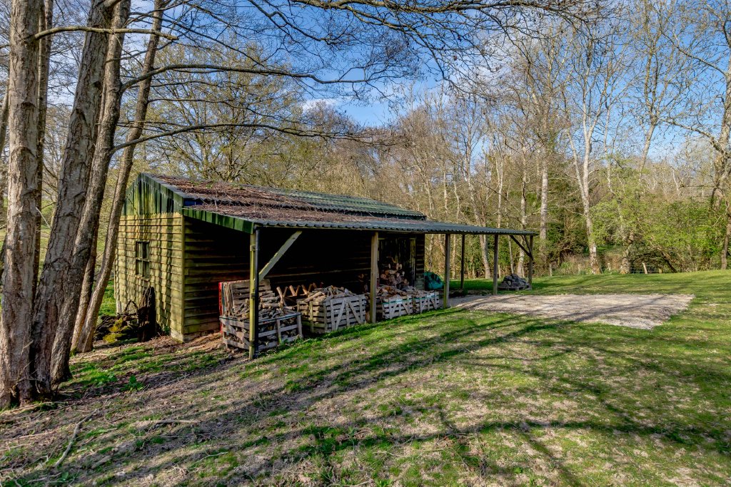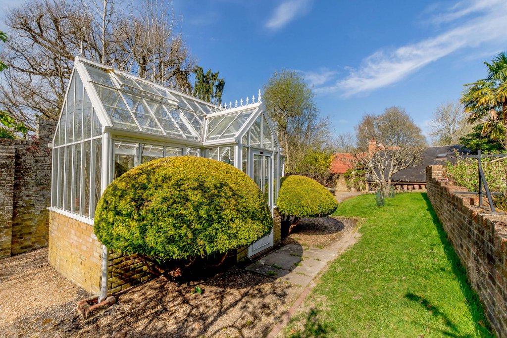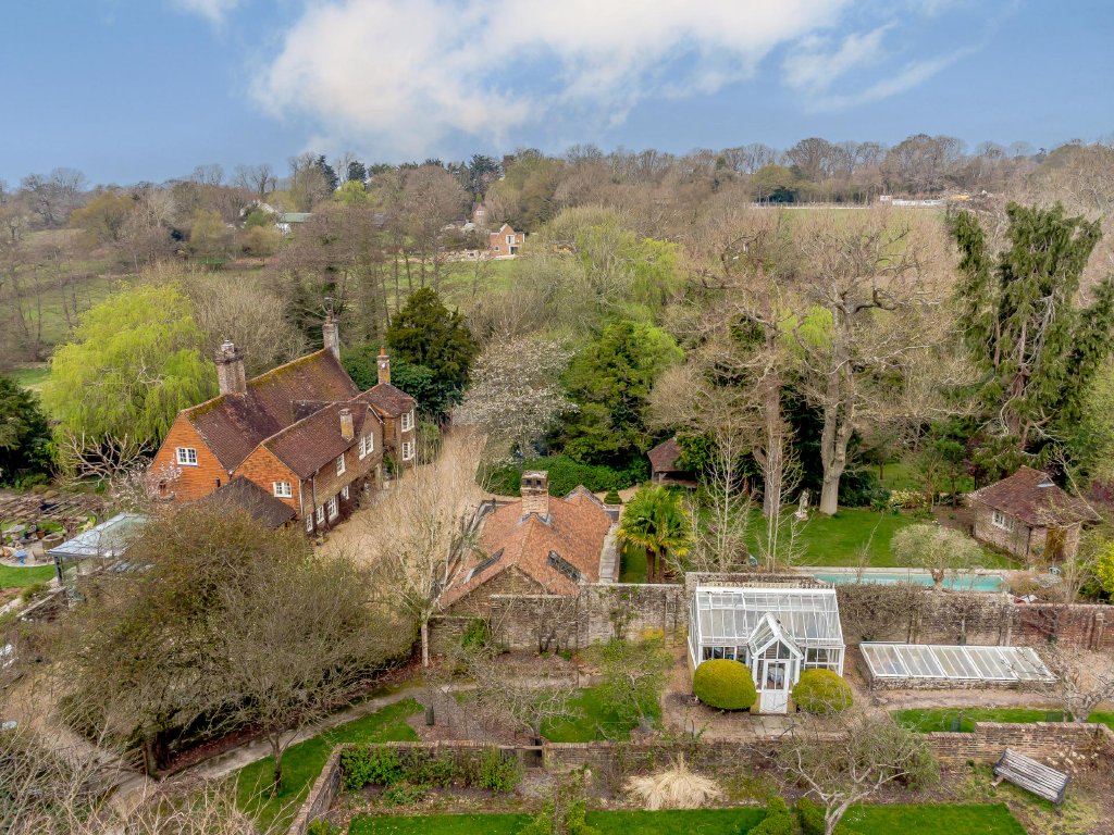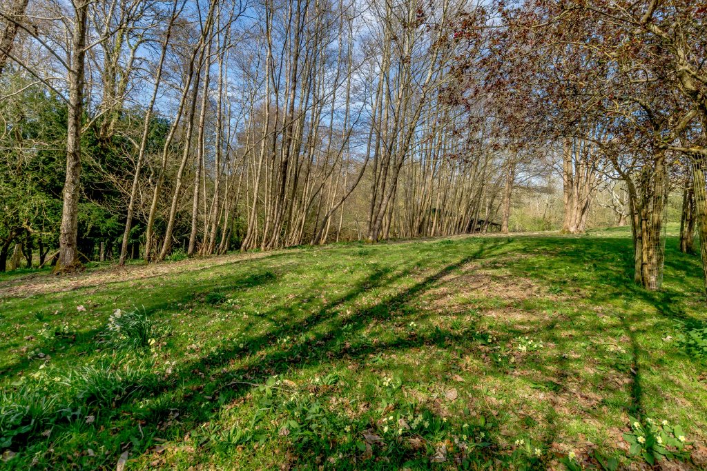 Steeped in history, it sits within an enchanted garden, partly laid out by Italian prisoners of war nearly a hundred years ago. The original tanning beds from when Tanyards was literally a tanning yard were discovered under the lake several years ago. Now it is a somewhat less industrious pace and home to a selection of ducks, moorhens, and wild carp. The shady tranquility of the lake leads across a rustic bridge to the old wishing well, where many mature shrubs and trees offer complete privacy. The travertine-tiled swimming pool is presided over by a mature and stately olive tree and has the gentle sound of trickling water from an antique Italian fountain nearby. A small chalet building behind the swimming pool houses an infrared sauna, steam room, and shower. An archway leads from the pool area to a mature orchard with plums, apples, pears, quince, cherries, figs, and soft fruit. At the edge of the orchard sits a large period-style greenhouse, the original cold frames, and a walled kitchen garden with raised beds. An adjacent ‘man cave’ offers plenty of room store garden tractors, bikes, and tools. The orchard area is neatly contained by a richly patinated wall carpet this area in spring, and a meandering path leads-as if by accident-to ‘Poet’s Corner’. The cool and dappled shade from the trees is a welcome retreat on a hot day, and the gentle sound from the period water fountain is immediately restful. Adjoining the property across the private lane is a paddock offering space for horses or other livestock. A timber barn provides further storage. Planning permission for the timber building is a possibility, which could further extend the flexibility of the accommodation.