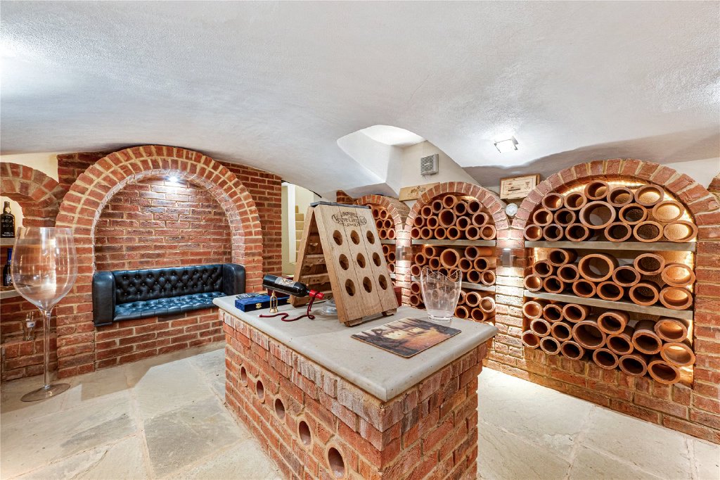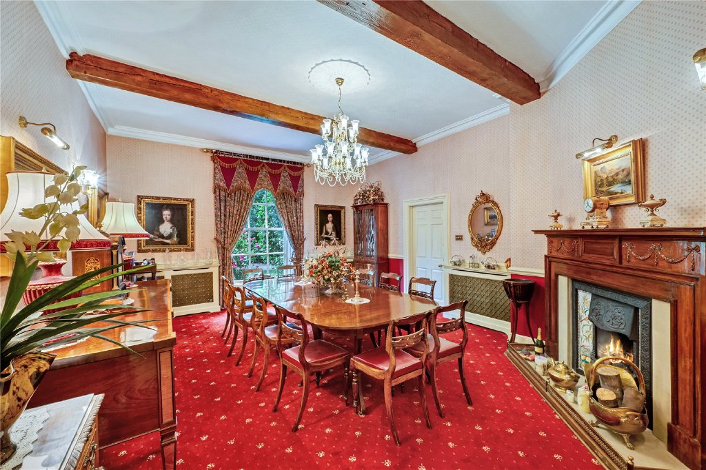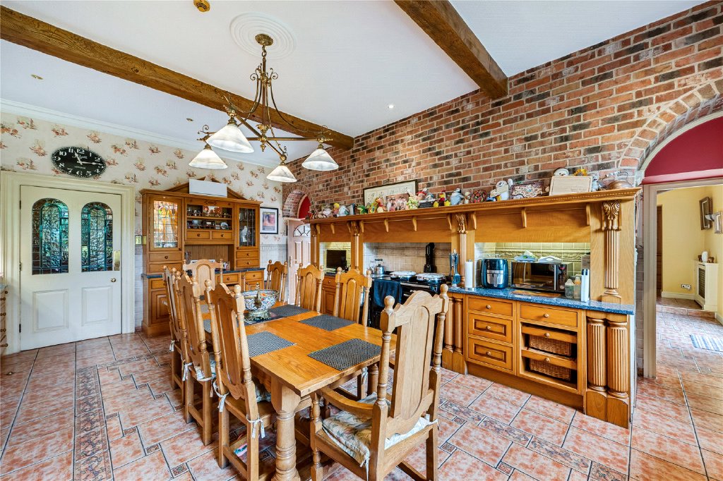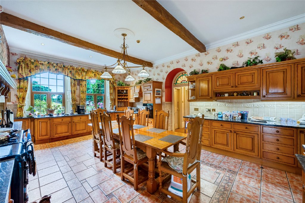 The ground floor features a series of beautifully connected living spaces, including a character-filled dining room with exposed oak beams, a welcoming family room, and a stunning south-facing sunroom that opens onto manicured lawns via French doors. At the centre of it all is the grand country kitchen, complete with a cast-iron AGA, oak beams, and stained-glass doors — the perfect hub for family life.