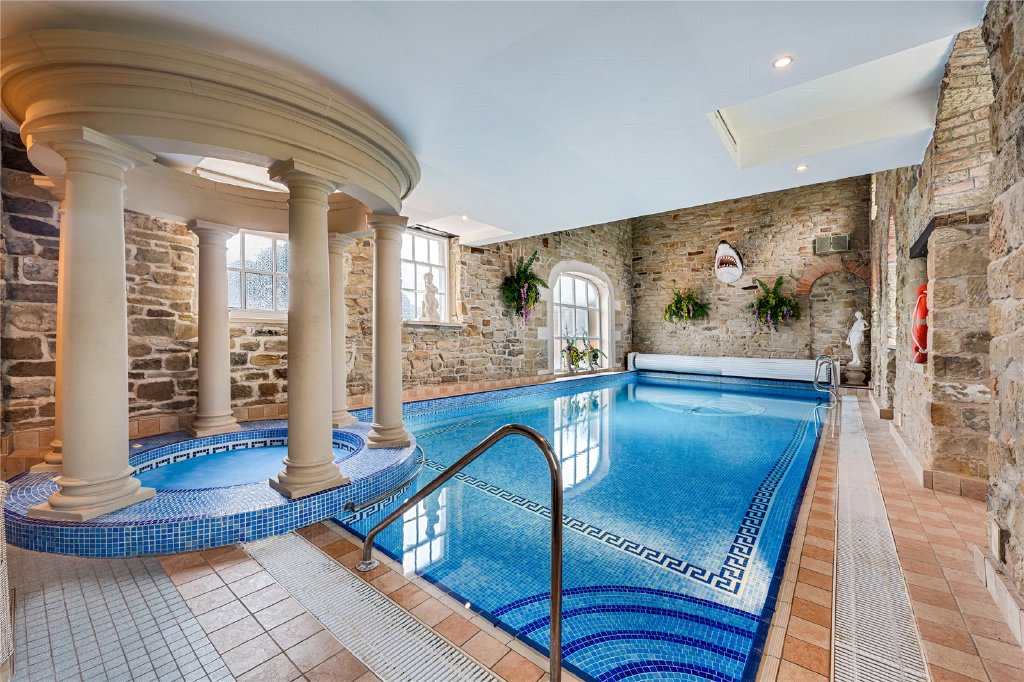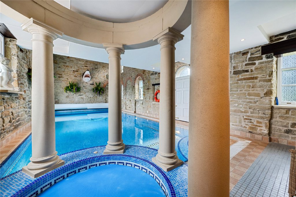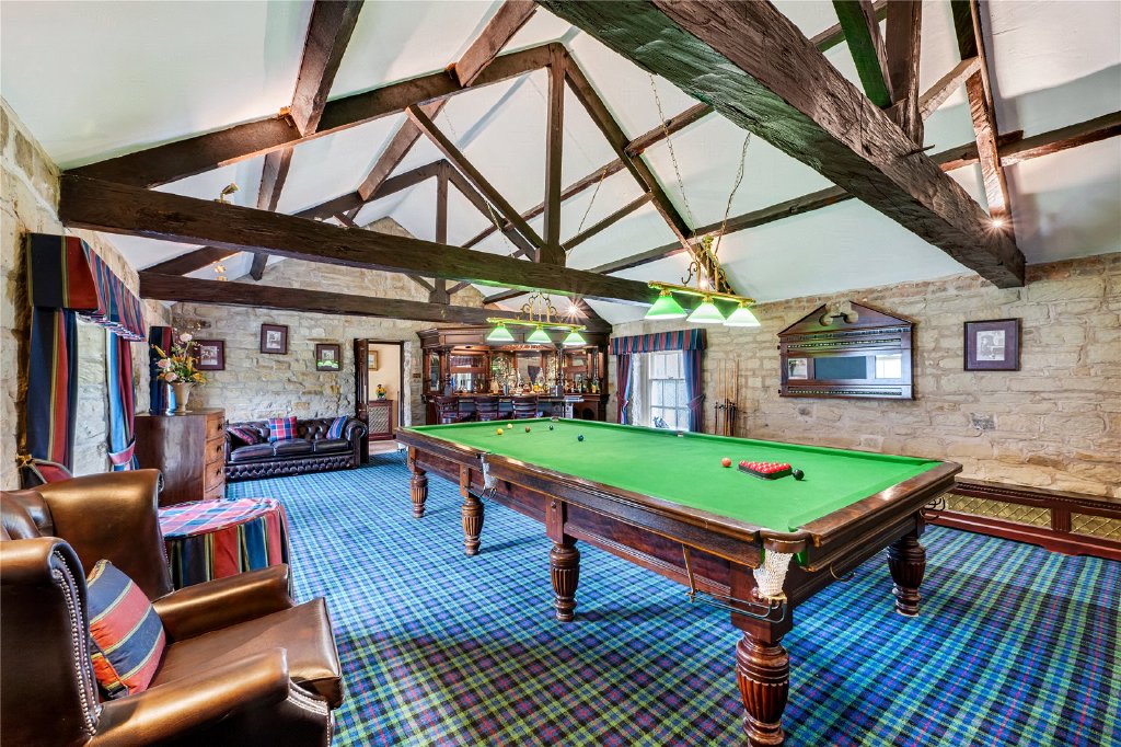 An internal corridor leads to one of the estate’s most extraordinary features: a private leisure and entertainment wing. A heated indoor pool stretches the full length of the east wing, framed by a vaulted oak-beamed ceiling and Ackworth stone. Adjacent spa facilities include a sauna, steam room, and changing suites. Above, the snooker room — complete with full-sized table and private bar — overlooks the pool, creating a truly unique entertainment experience.