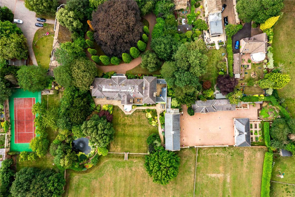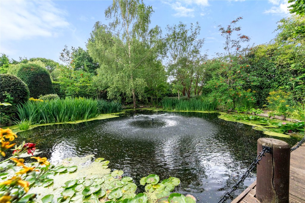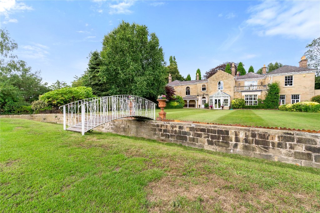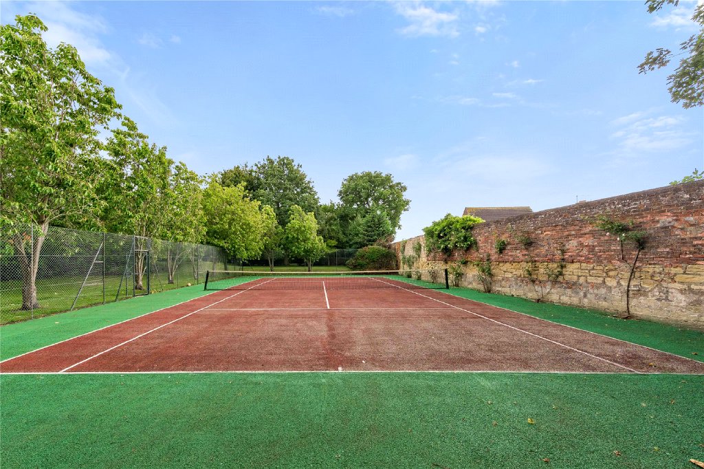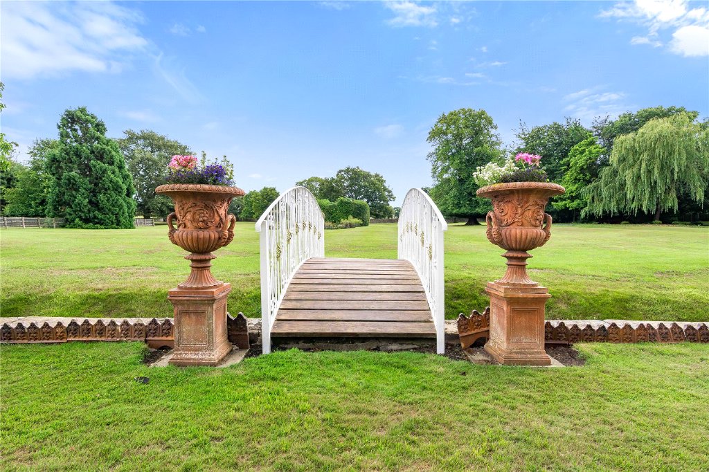 The grounds are as impressive as the interiors: landscaped lawns, a large ornamental pond with fountain, a resurfaced tennis court, and a productive orchard filled with apples, pears, cherries, and plums. A ha-ha and arched bridge lead into the wider parkland, with woodland trails and a fenced paddock completing the estate.
