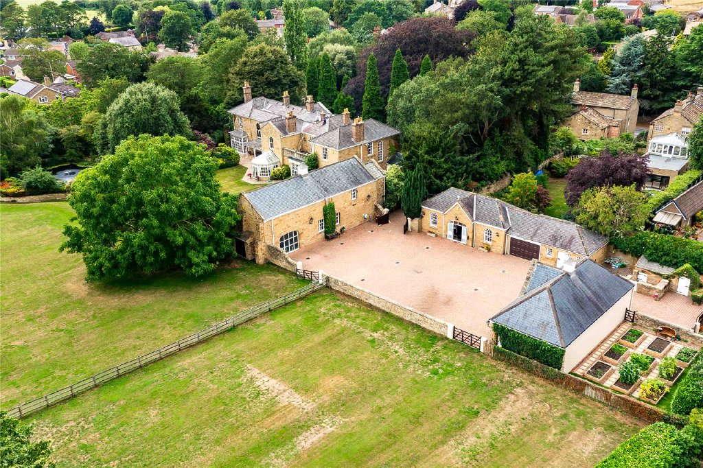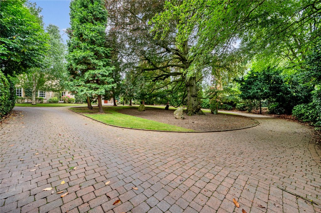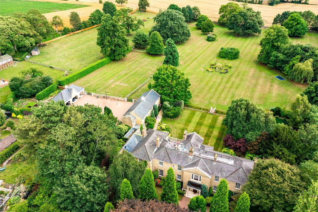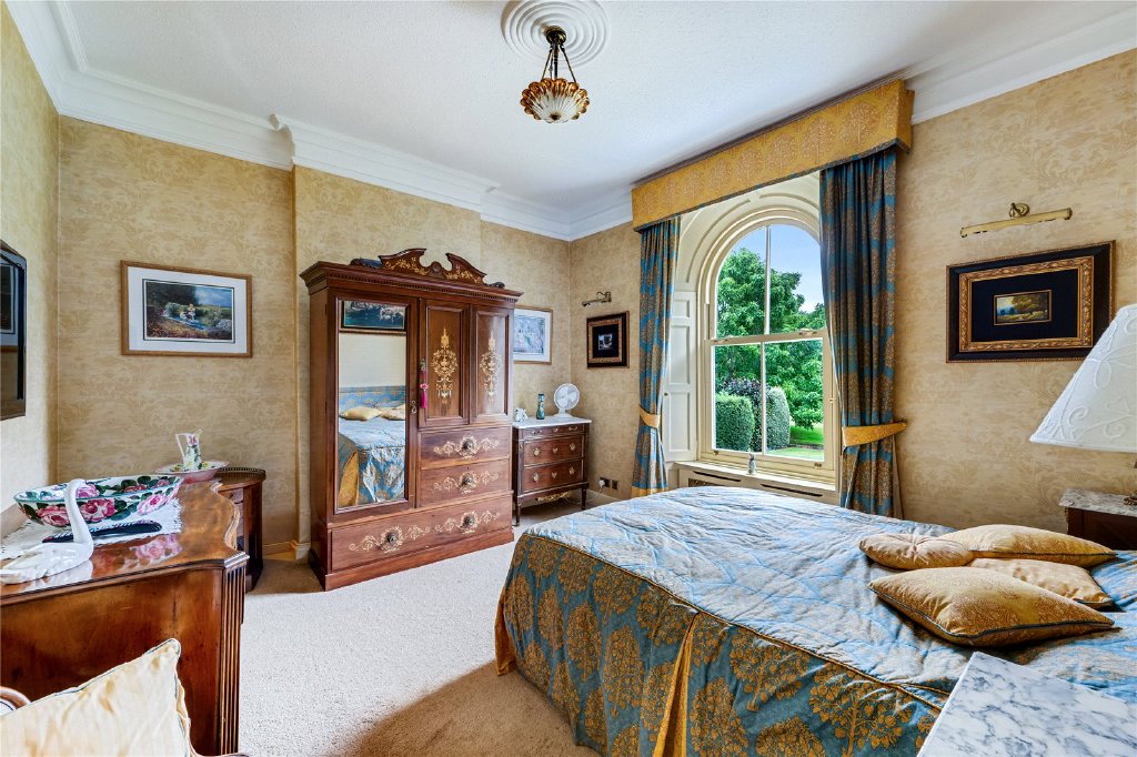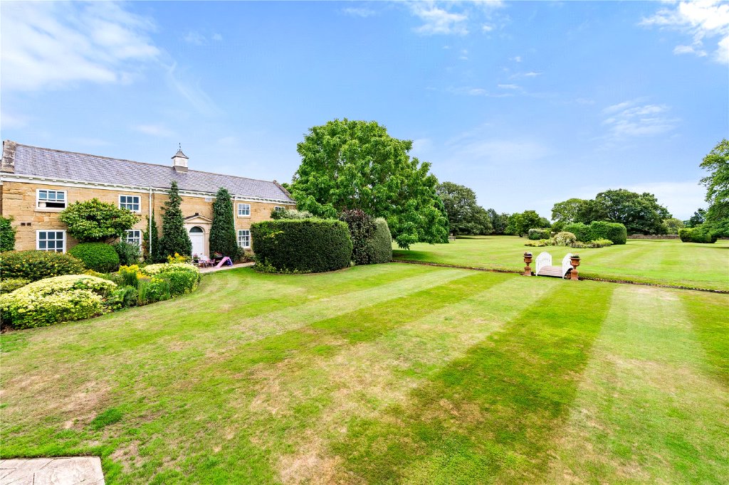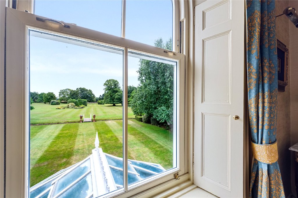 The grounds are as impressive as the interiors: landscaped lawns, a large ornamental pond with fountain, a resurfaced tennis court, and a productive orchard filled with apples, pears, cherries, and plums. A ha-ha and arched bridge lead into the wider parkland, with woodland trails and a fenced paddock completing the estate.
