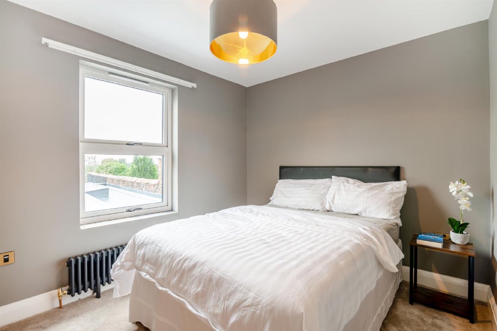 Two generously proportioned bedrooms are found on the first floor, served by the family bathroom. Finished with striking emerald-green tiles, gold fixtures, and a shower-over-bath combination, it combines luxury with everyday convenience. A fitted storage cupboard provides further practicality.