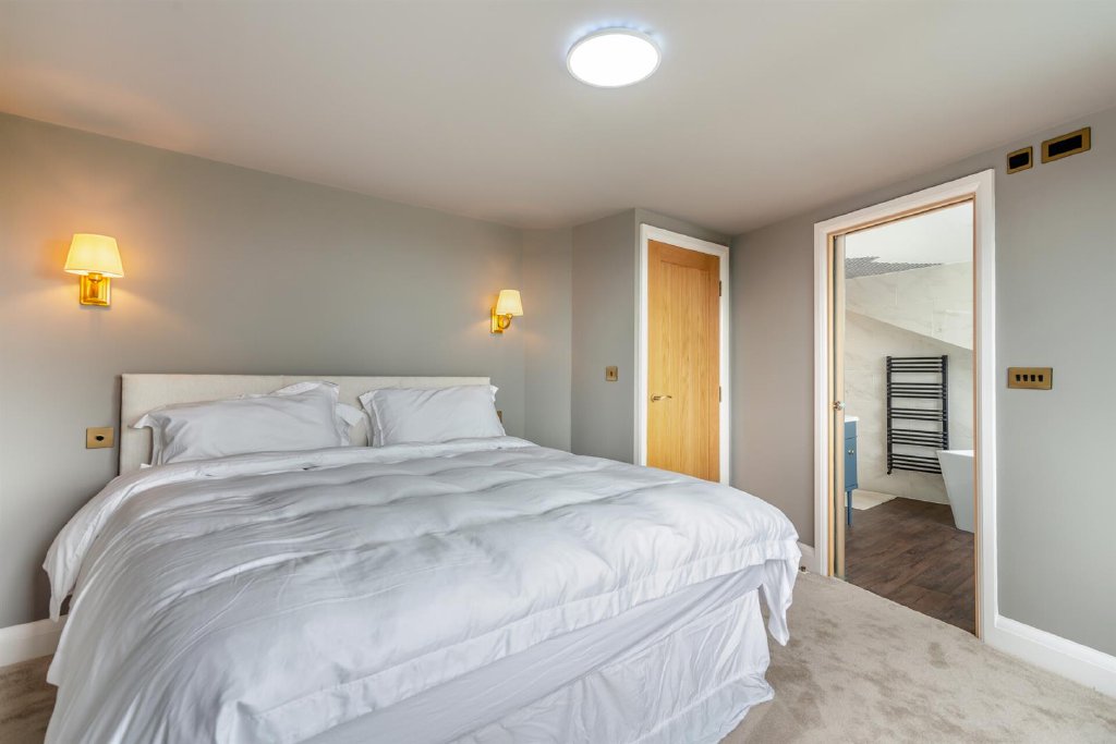 The entire top floor is dedicated to the principal suite, a sanctuary of calm. Arriving at a foyer space, there is potential for a dressing area or private office. The bedroom itself enjoys sweeping views over the garden and village rooftops, while the luxury en-suite boasts blue cabinetry, a freestanding bath, and a striking walk-in shower with coordinating tiles - a true spa-like retreat.