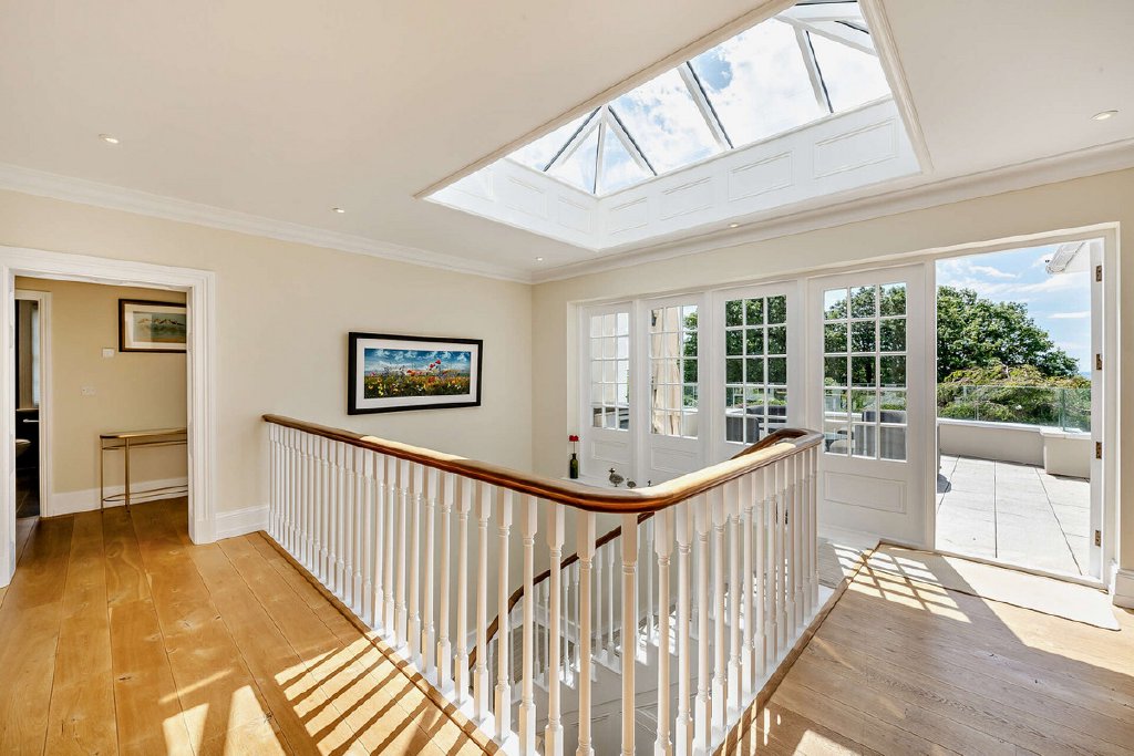 Ascending the staircase to the galleried landing, illuminated by a newly upgraded atrium, glazed French doors lead onto an expansive south-facing terrace, a unique vantage point from which to enjoy the property’s commanding setting, with spectacular views across the coastline.
