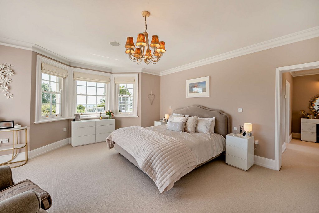 The principal bedroom suite is a haven of elegance, featuring a bay window with panoramic sea views, French doors to the terrace, a dressing area and a luxurious en-suite bathroom.