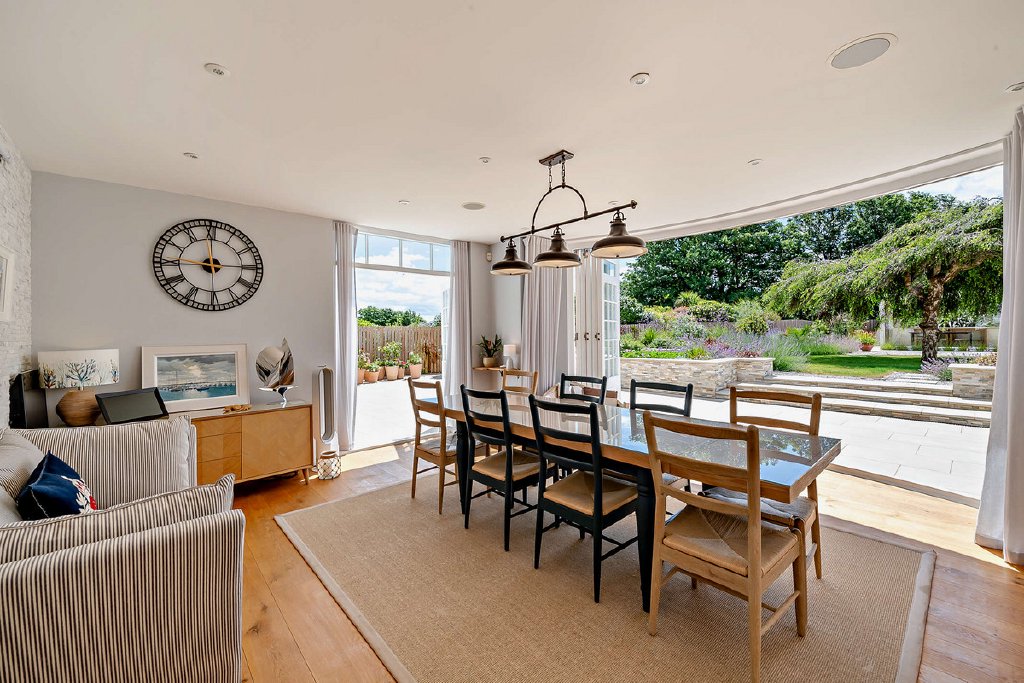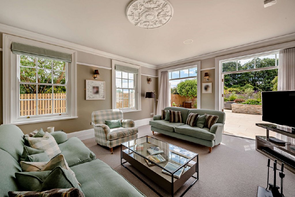 The living spaces are both versatile and inviting, comprising four refined reception rooms: a dual-aspect sitting room with two sets of French doors and a Chesney fireplace, a drawing room, a dining room, currently used as a pool room with bi-fold doors, seamlessly connecting to the outdoor entertaining spaces.