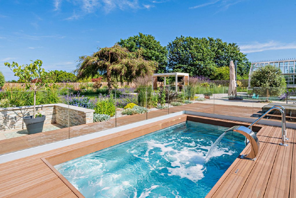 The rear garden is a true sanctuary, designed for both tranquillity and entertaining. A broad stone terrace offers ideal space for al fresco dining and summer gatherings, bordered by established shrubs and flowerbeds. An impressive Hartley Botanical greenhouse, resistance swimming pool with integrated spa, and sun terrace enhance the lifestyle offering.