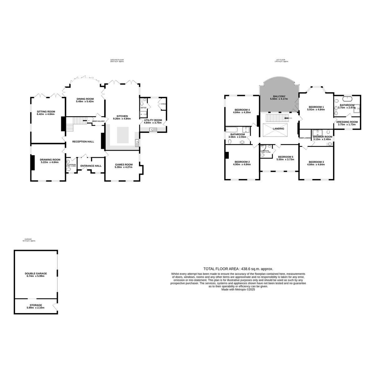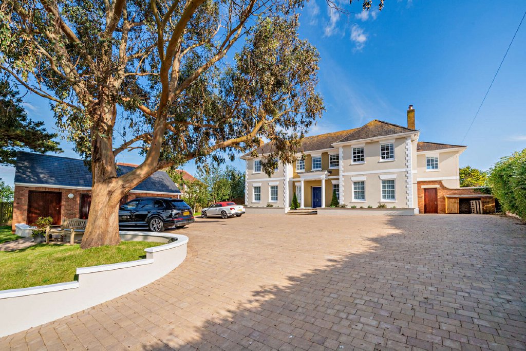 Approached via a sweeping private driveway flanked by manicured lawns and ornamental trees, the house is beautifully positioned within 0.65 acres of landscaped gardens. Ample parking is provided alongside a detached double garage with electric car charging and storage space.