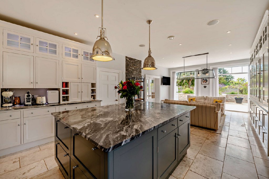 To the right of the hall lies a superb bespoke kitchen and breakfast room, crafted by Warren Hughes and finished with marble worktops and a generous central island. French doors lead directly onto the gardens, perfect for morning coffee with a sea breeze. Adjacent lies a large utility room and a contemporary shower room.