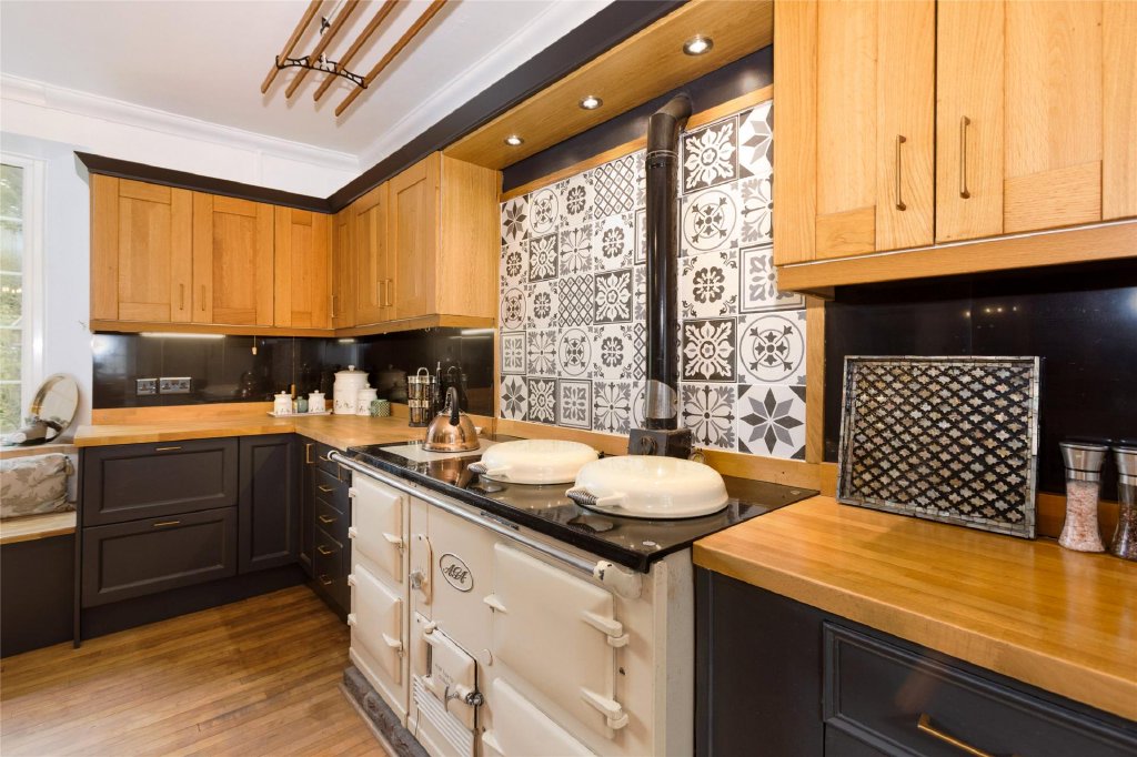 Returning to the main house, there is the dining room, featuring an ornate fireplace. The recently renovated kitchen boasts maple floors and worksurfaces, an oil-fired AGA, and a butler’s pantry complete with a double oven and induction hob. Adjacent to the kitchen is the newly constructed breakfast room—a light-filled space perfect for entertaining, with doors that open onto the patio and doors to the dining room.