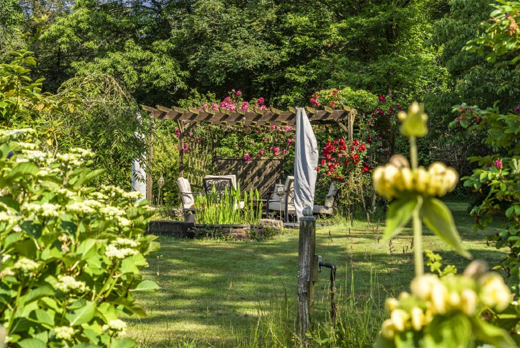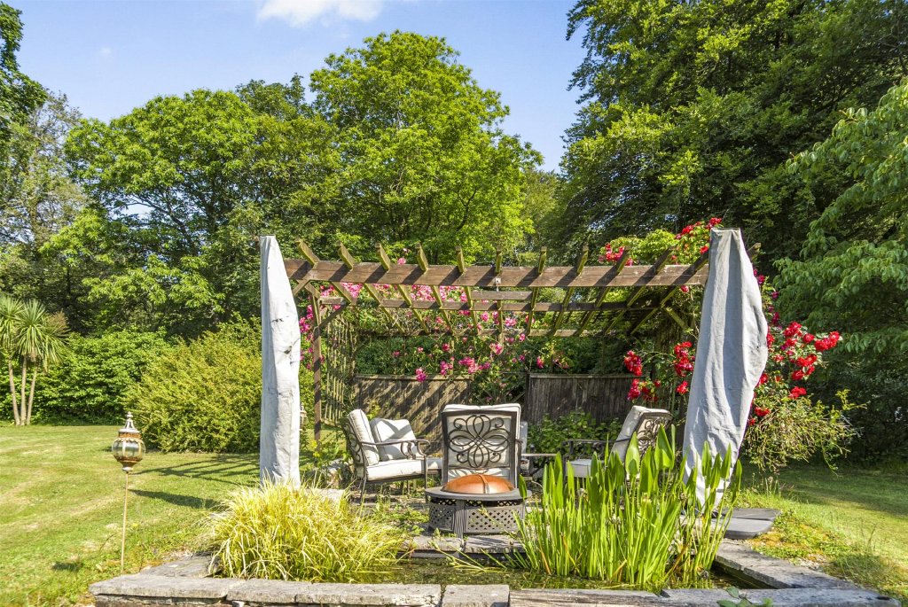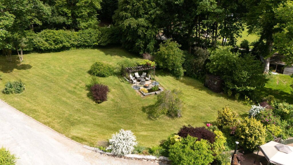 Hawkmoor House has a delightful mature garden filled with lawns, mature shrubs, and trees. Just outside the kitchen and breakfast room, you will find a spacious patio with a veranda, perfect for lively gatherings or peaceful morning coffees. Further along the lawn, is another patio area with a fishpond—an all-day suntrap!