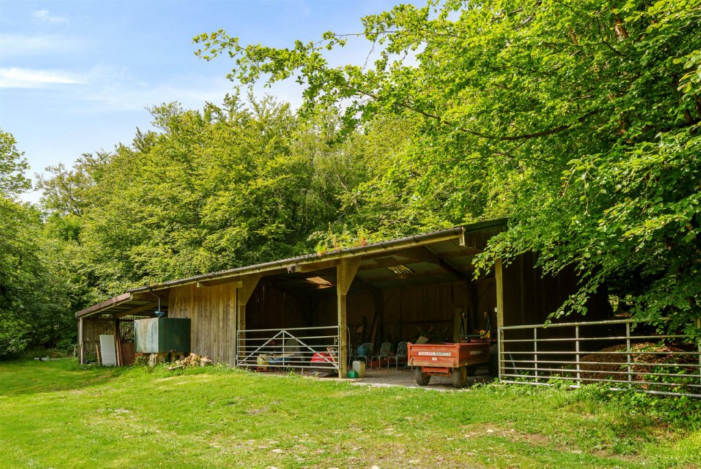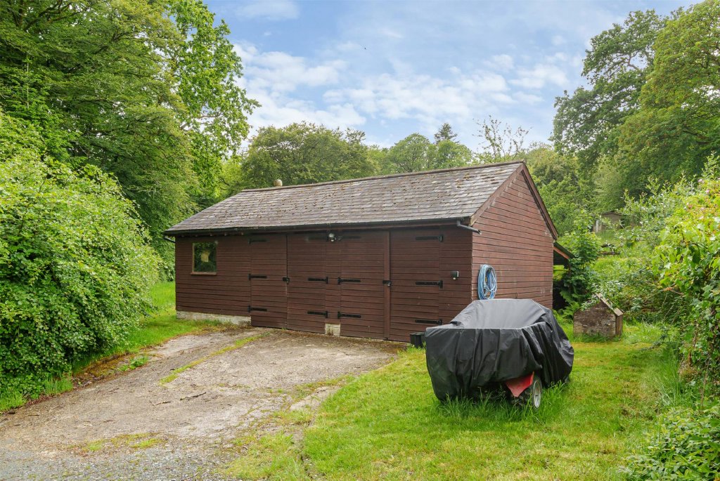 The property is approached via a long, private driveway leading to a large parking area with ample space for multiple vehicles. Adjacent to the drive, a timber workshop and garage provide excellent storage, with a second garage offering even more room for outdoor equipment. Additionally, a timber-framed, open-fronted barn offers convenient shelter for garden machinery or extra vehicle storage.