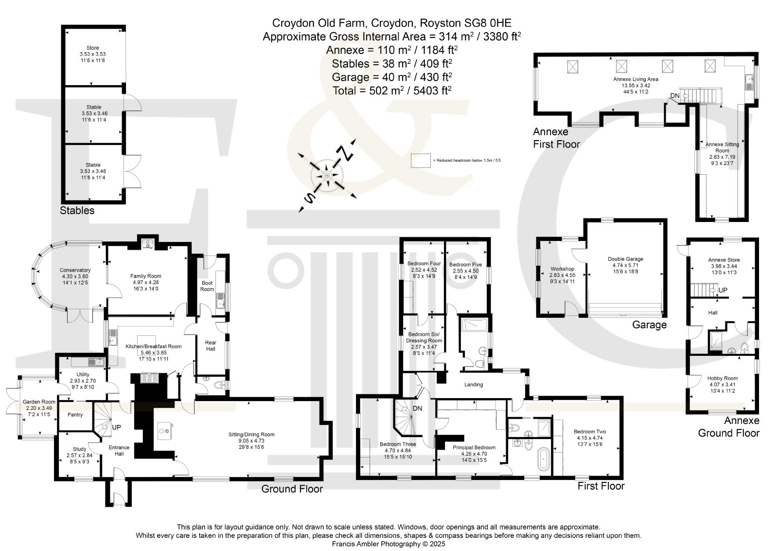 The main house provides generous family accommodation, with a superb kitchen/breakfast room at its heart, flowing into a family room and conservatory, perfect for entertaining or everyday living. A formal sitting/dining room, study, and practical boot and utility rooms complete the ground floor. Upstairs, the principal suite enjoys a dressing room and luxurious bathroom, complemented by four further bedrooms and a family bathroom.