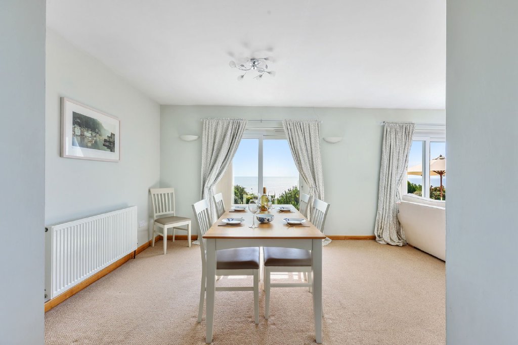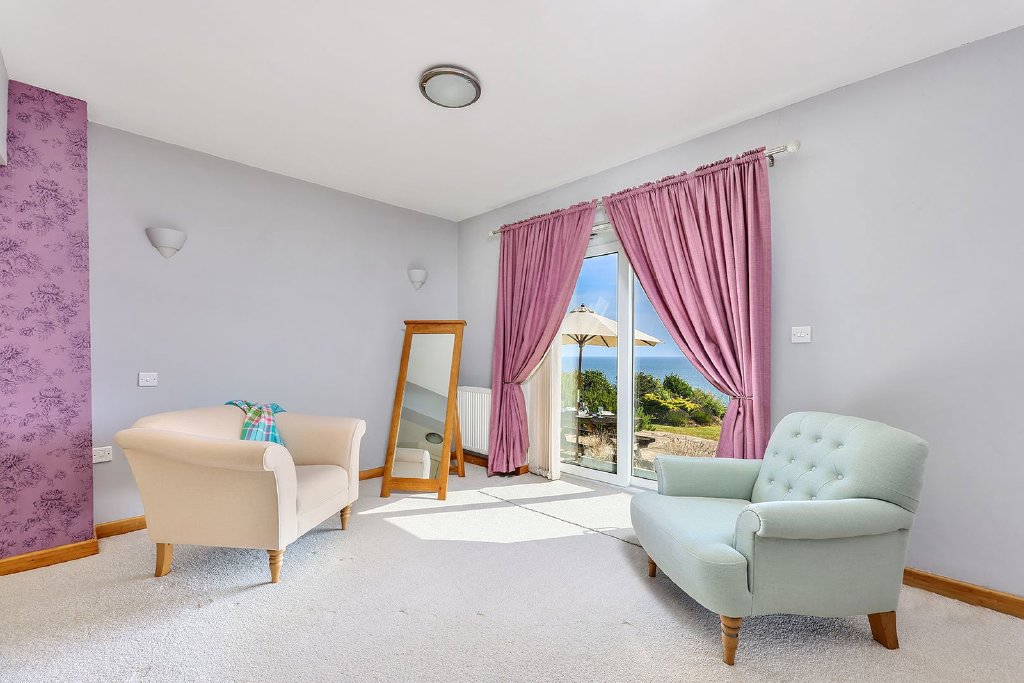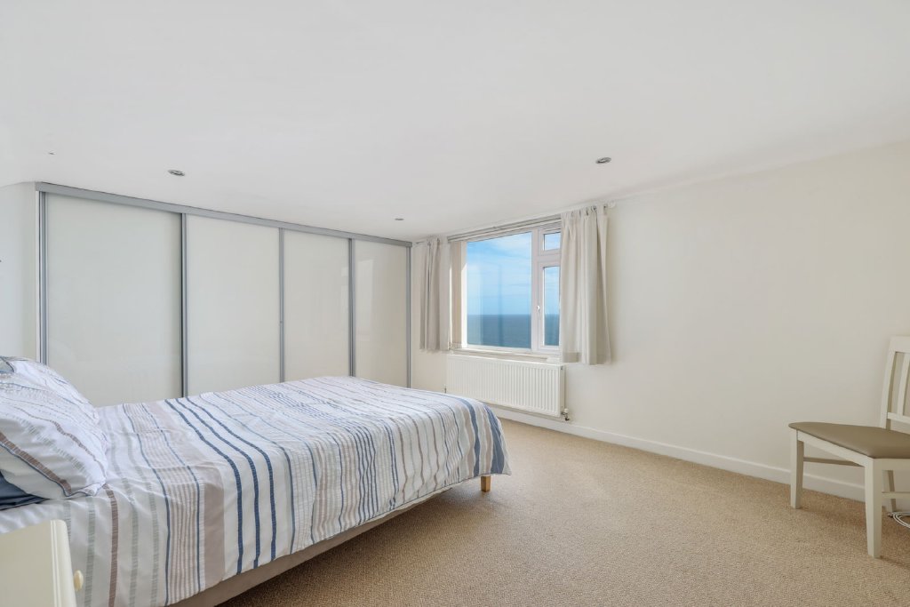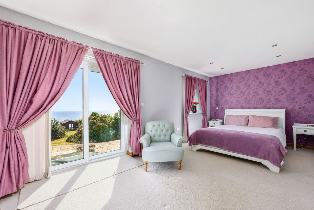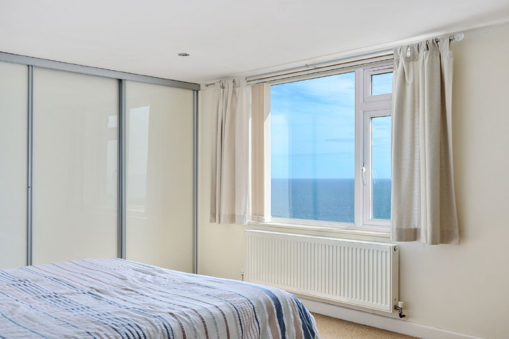 The final double bedroom offers a luxurious Super King sized bed, complemented by a generous array of fitted wardrobes with sleek glass sliding doors. This room, too, showcases a magnificent view of the sea and coastline, enhancing its appeal.