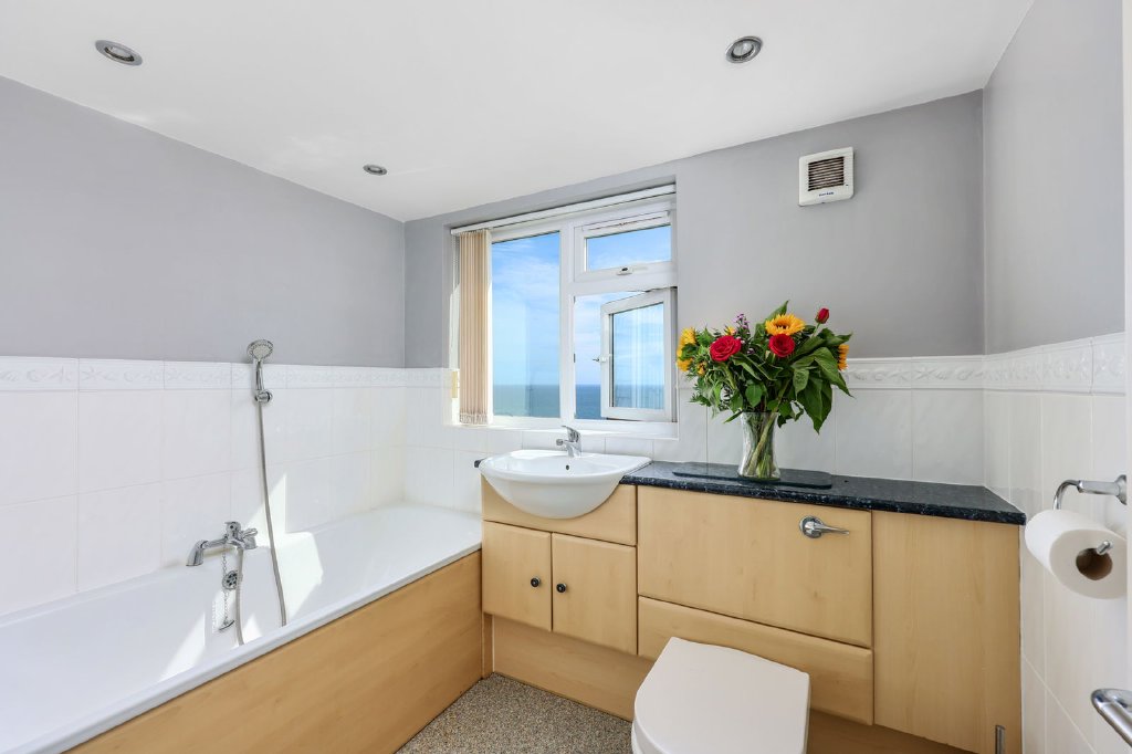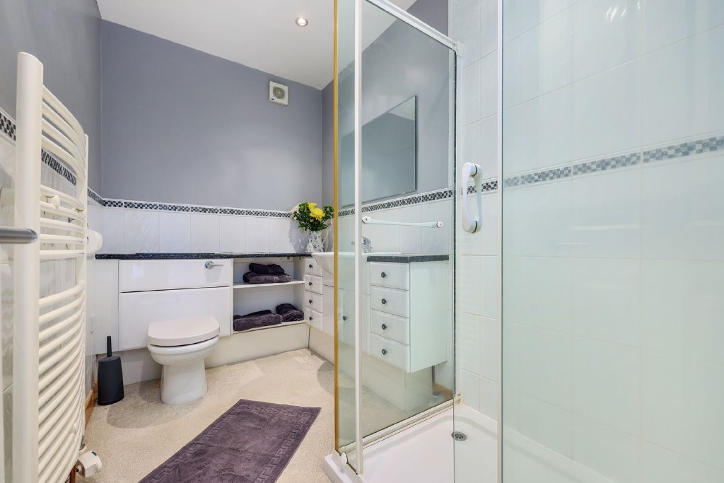 Conveniently next door is a separate Family bathroom, featuring pristine white units and tiles adorned with a charming dolphin theme. It is fully equipped with a full-sized bath and a shower overhead, alongside a wash hand basin and toilet.