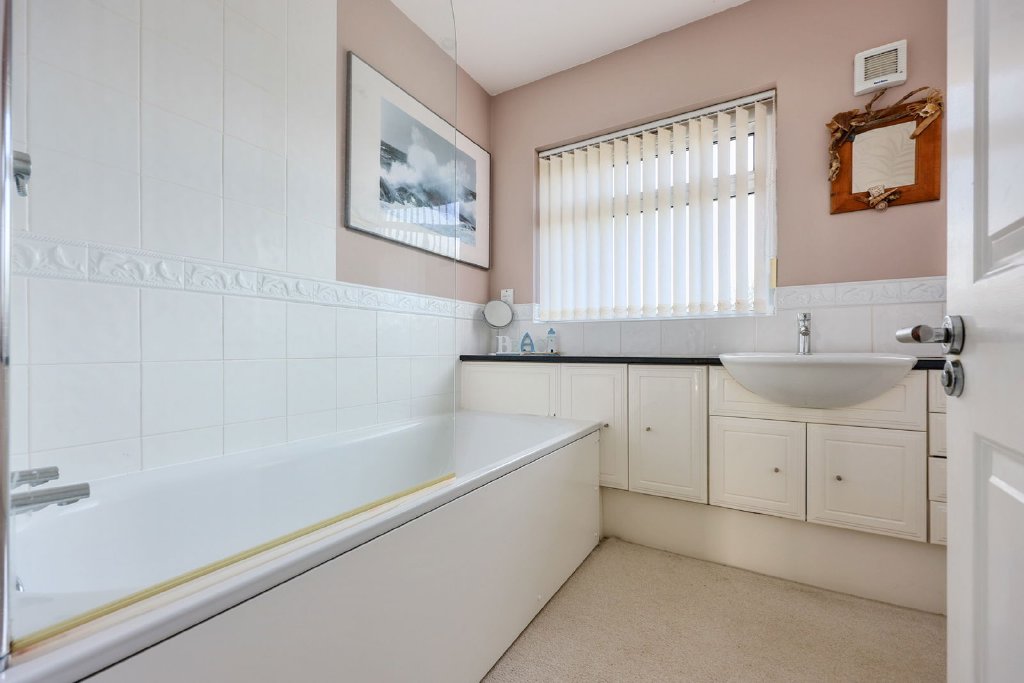 Nestled conveniently between the bedrooms, the third bathroom boasts elegant white units complemented by a charming sea shell tiled splashback. It features a low-level hand shower, a wash hand basin, and a toilet, making it both functional and stylish.