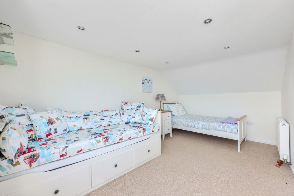 At the top of the stairs, a door leads into an exquisite L-Shaped double bedroom. This room, also furnished with twin beds and a free-standing wardrobe, boasts a large window that captures breathtaking elevated views of the garden, coastline, and sea, stretching from Bolt Head and Thurlstone in Devon towards the stunning Lizard Peninsula in Cornwall.