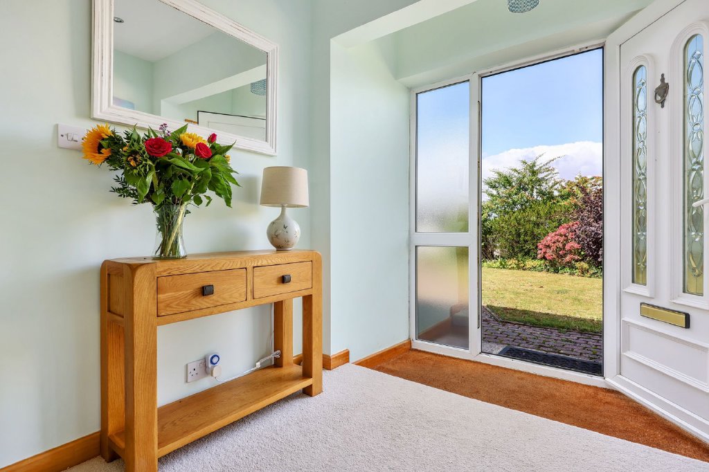 As you arrive at the front of the property, a smaller lawned garden awaits, featuring raised flower beds and tall shrubs that cleverly disguise the oil tank, enhancing the property’s appeal and maintaining its picturesque charm.