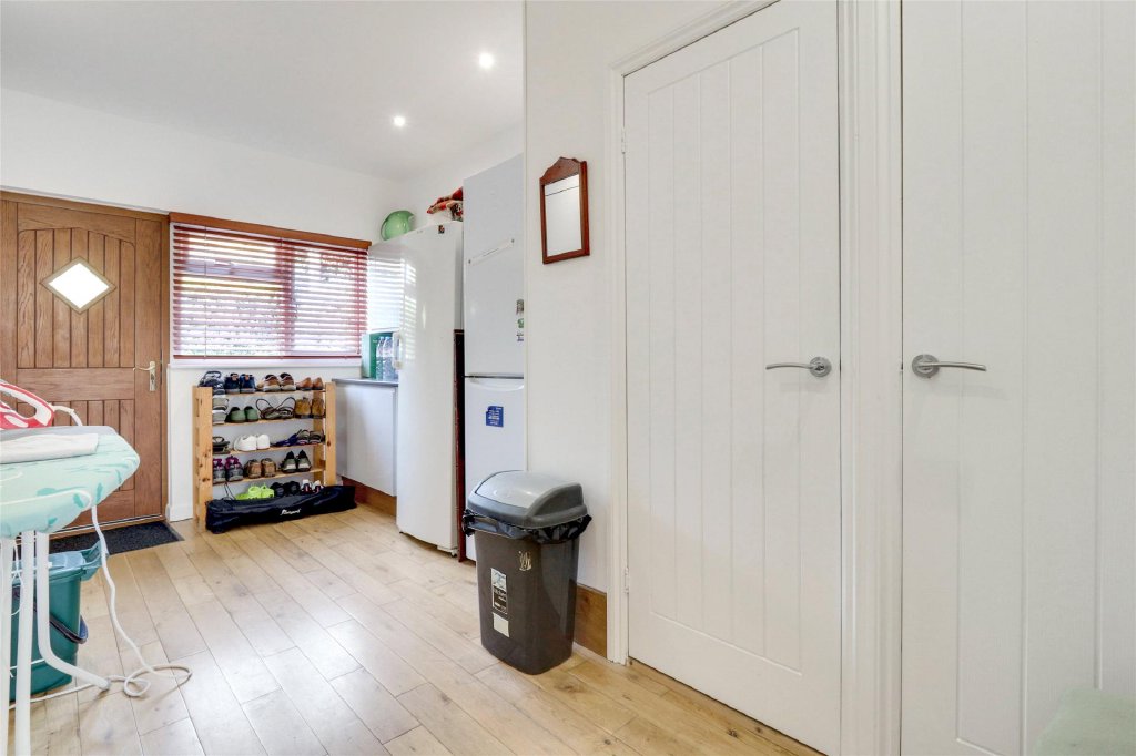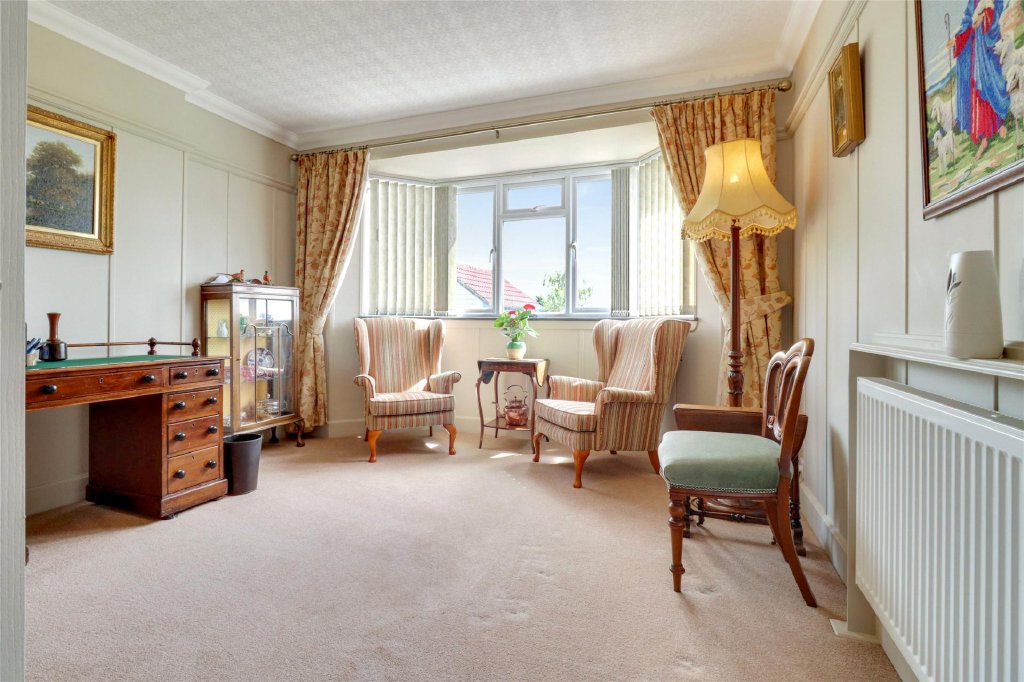 From the kitchen, there is access to a spacious utility room and separate rear lobby, with doors leading to the front and rear of the property, plumbing for white goods, and ample storage space. The formal dining room, currently serving as an office and second reception room, features attractive panelling and a pretty bay window overlooking the rear garden.