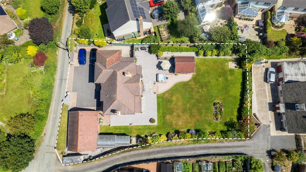 The property is accessed from Gunswell Lane via a private driveway flanked by beautifully crafted stone walls, offering ample parking for multiple vehicles and a double garage with an electric roller door and a boarded level of storage above. Behind the garage is a useful workshop area, and there are three additional storage outbuildings, all in excellent condition.