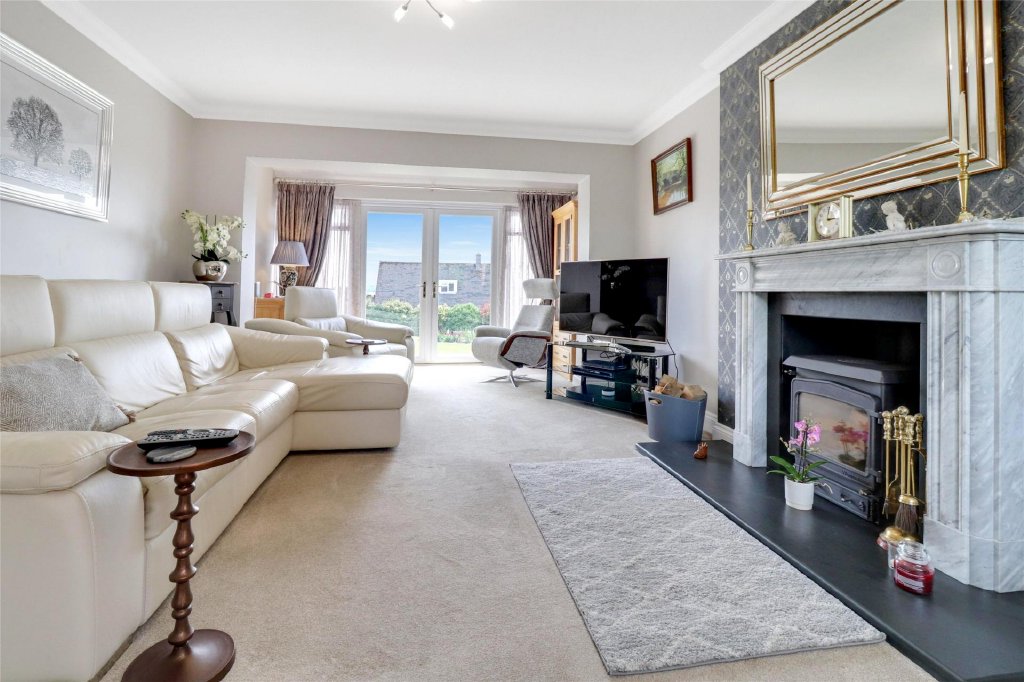 The living room is another well-appointed and spacious area with a feature fireplace housing a wood-burning stove, ample space for sizable furniture, and double doors opening to the beautiful rear garden.