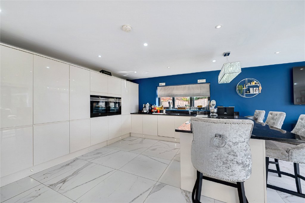 To the rear, the heart of the home is the stunning open-plan kitchen and dining room with seating area, featuring stylish units, integrated appliances with a double fridge/freezer, and a large island for entertaining. Bi-folding doors spanning the entire kitchen to the south-facing garden seamlessly open out to the garden, creating a wonderful indoor-outdoor flow, ideal for summer gatherings. Additional practical features include a utility room, keeping the household running smoothly, with underfloor heating throughout the downstairs footprint. A downstairs bedroom (currently used as a lounge) with its own modern en-suite, perfect for guests, older children, or multigenerational living. With the option of this room to possibly extend above for a more dedicated bedroom/living space (subject to planning.)