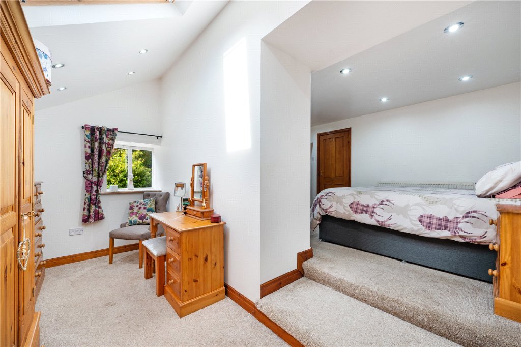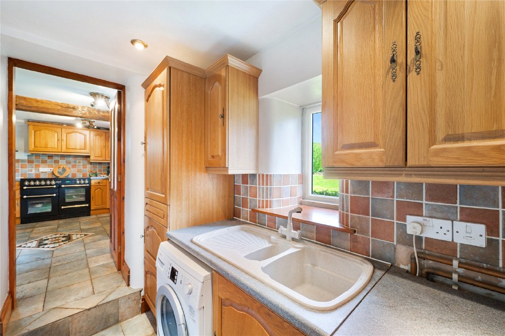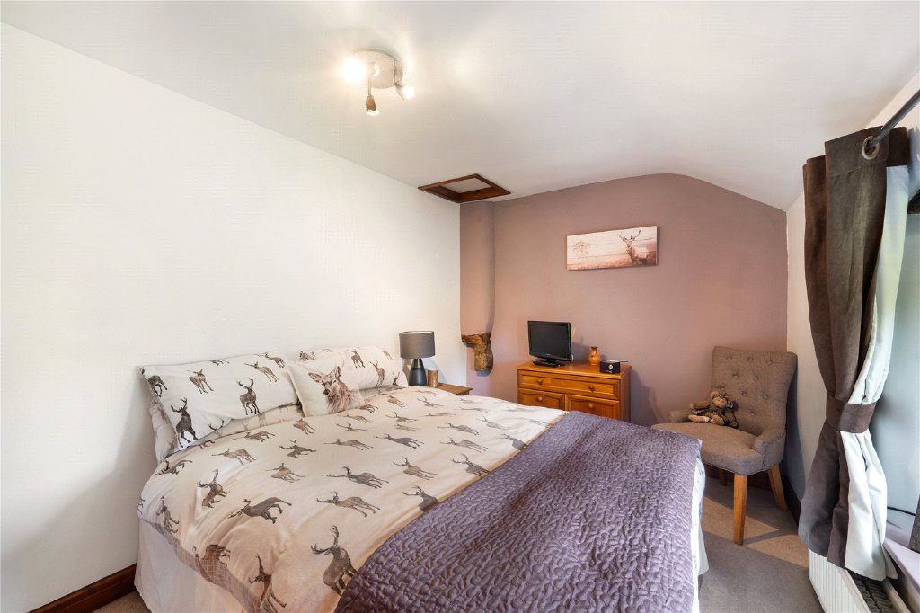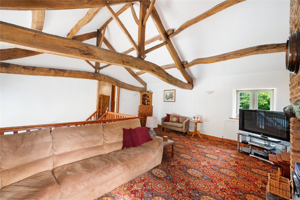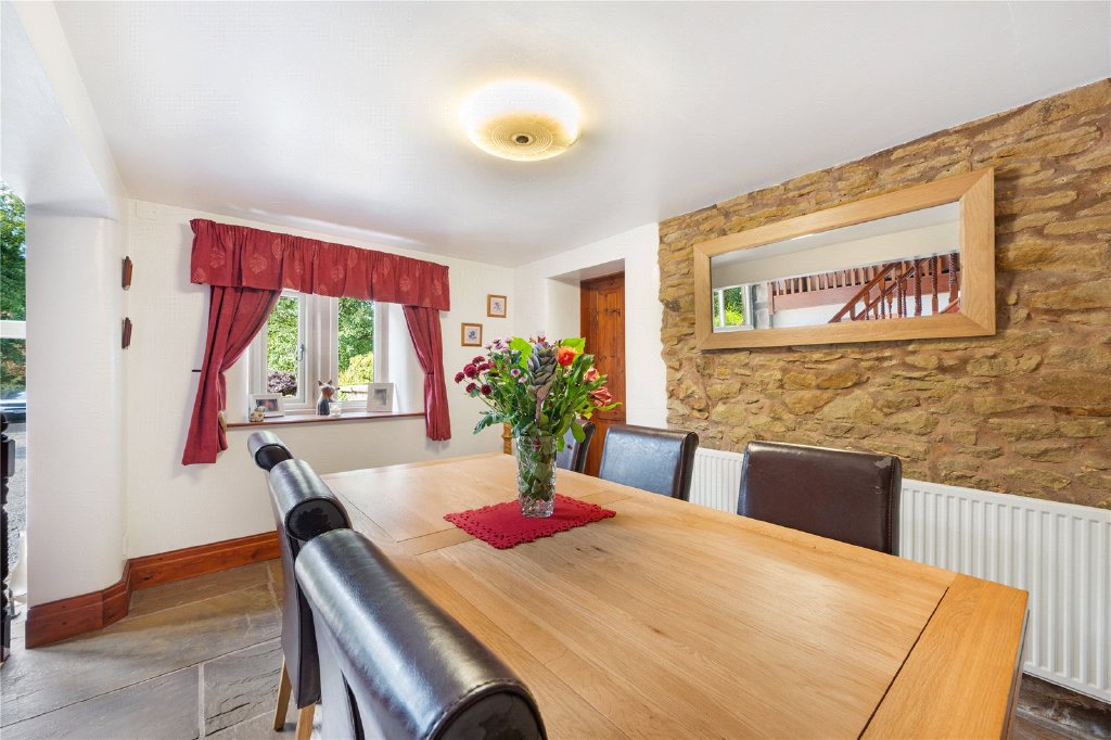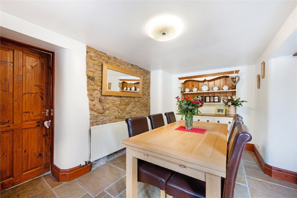 The accommodation begins with an impressive entrance hallway running from front to back, where a vaulted beamed ceiling and a striking glazed barn arch create a memorable welcome. From here, the principal bedroom leads down to a dressing room with Velux window, together with a 2pc en-suite. A modern 3pc family bathroom is also located on this level, beautifully appointed with contemporary fittings. A step from the hallway leads into the dining area with stone-flagged flooring and part-exposed stone wall, which in turn flows through to the family breakfast kitchen. This inviting space is fitted with oak-fronted base and eye-level units, a breakfast bar, built-in pantry, space for a range cooker, plumbing for a dishwasher, a 1.5 bowl sink with mixer tap and a feature wood-burning stove. It also retains the original front door, which adds to its character. Adjoining the kitchen, the utility room provides excellent practicality with plumbing for a washing machine, space for an integrated fridge and freezer and houses the floor-mounted Worcester boiler.