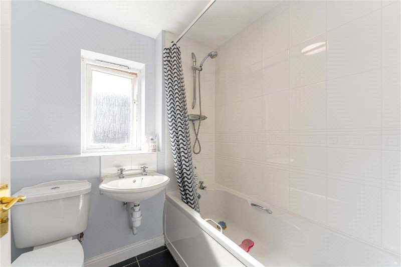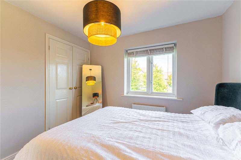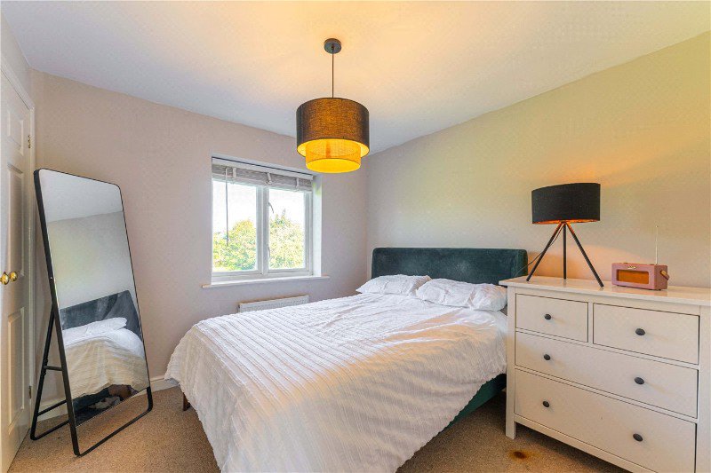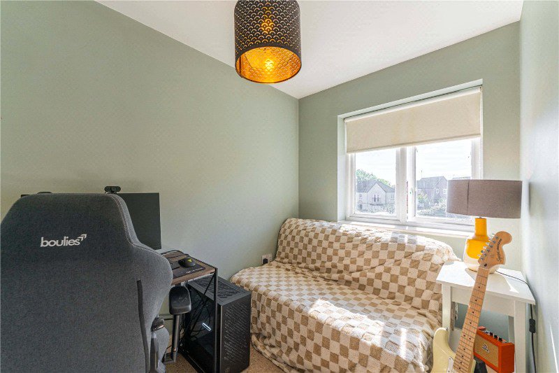 Ascending to the first floor, you will find two double bedrooms. The principal bedroom is a spacious double with views over the rear garden, while the second bedroom—currently used as a home office—features fitted cupboards and overlooks the greenery to the front. A contemporary family bathroom serves both rooms, fitted with a bath and shower, WC, and basin. While functional, it offers scope for modernisation.