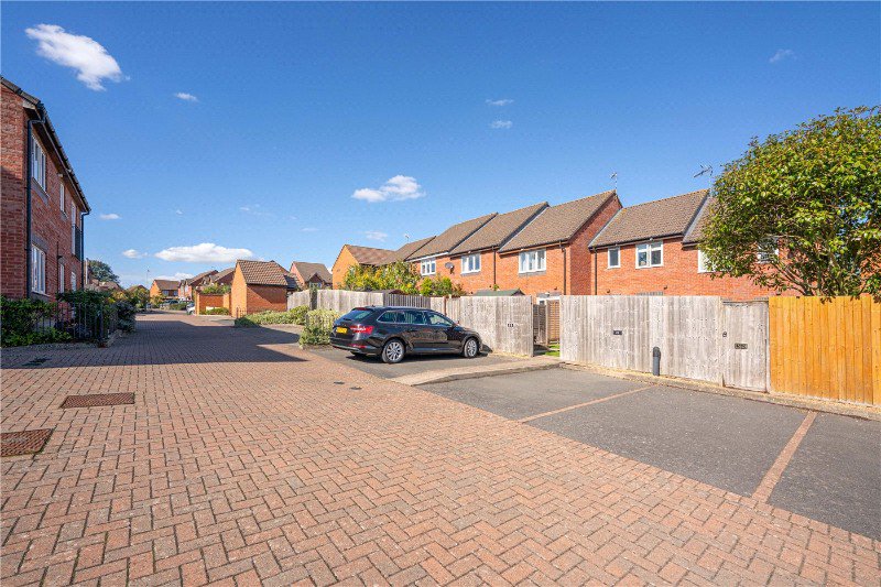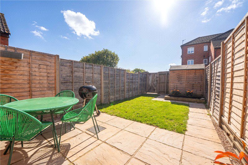 To the rear of the property lies a beautifully maintained garden. A central lawn is complemented by an extended patio terrace, perfect for summer dining or entertaining, with the added convenience of a garden shed. Beyond the garden, an allocated off-street parking space is situated for the property.