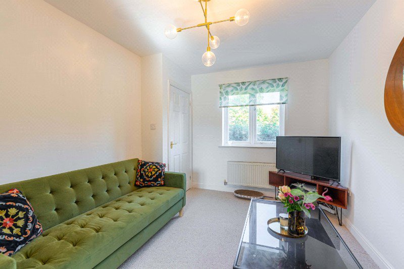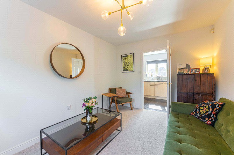 Once inside, a compact carpeted hallway welcomes you and leads directly into a generous sitting room. This bright reception space enjoys open views across the green space to the front of the property, providing a calm and inviting atmosphere.