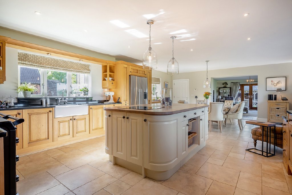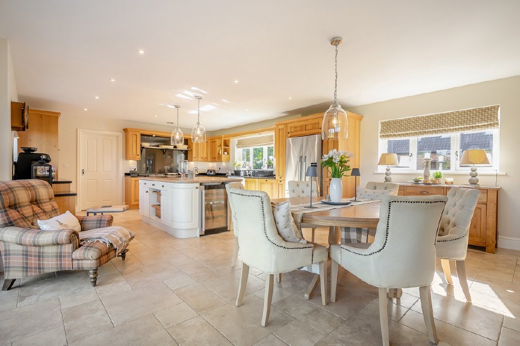 Electric gates open onto a sweeping circular driveway, and the tone is set for a truly luxurious home. An impressive barn style oak and glazed front door opens into a central stone flagged reception hall which is literally flooded with natural light, there is also a bespoke in-floor wine cellar and a guest cloakroom. All three reception rooms lead off the hallway. The main reception is a large and beautifully bright room with a window to the front overlooking the driveway and French doors to the rear opening to a sun terrace, there is a stone fireplace with wood burner. To the rear of the hall is another large reception room currently used as a formal dining room, it has French doors at either end opening to sun terraces; it is part-panelled and has another stone fireplace with a living flame gas fire. The last of the reception rooms is a superb family room which opens into the stunning kitchen. This room has a solid oak floor and is a lovely bright room with a large window overlooking the garden and French doors opening to a sun terrace.