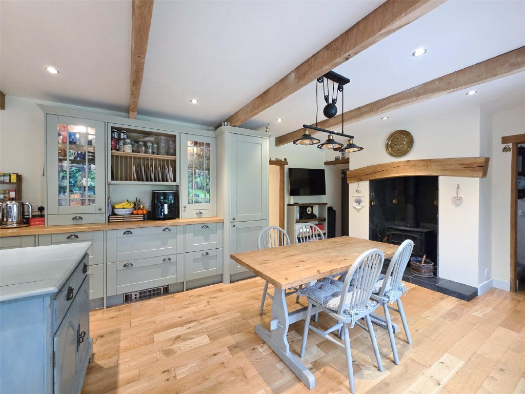 Additional reception rooms include a dual aspect lounge with double doors opening onto the patio. This room features an attractive fireplace with a multi-fuel burning stove, forming a striking focal point. The family kitchen/dining room is the heart of the home and has been entirely re-fitted with a Howdens kitchen featuring oak worktops. Ample storage is provided by a comprehensive range of wall and base units. Included in the sale is a Belling range style cooker with induction hob and extractor hood. Integrated appliances include a fridge, freezer, and dishwasher. A further multi-fuel stove provides warmth, and a door leads directly to the garden.