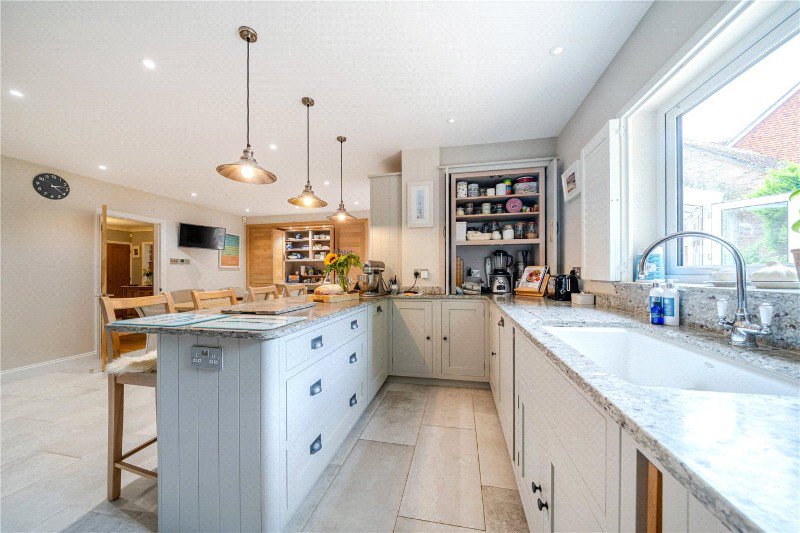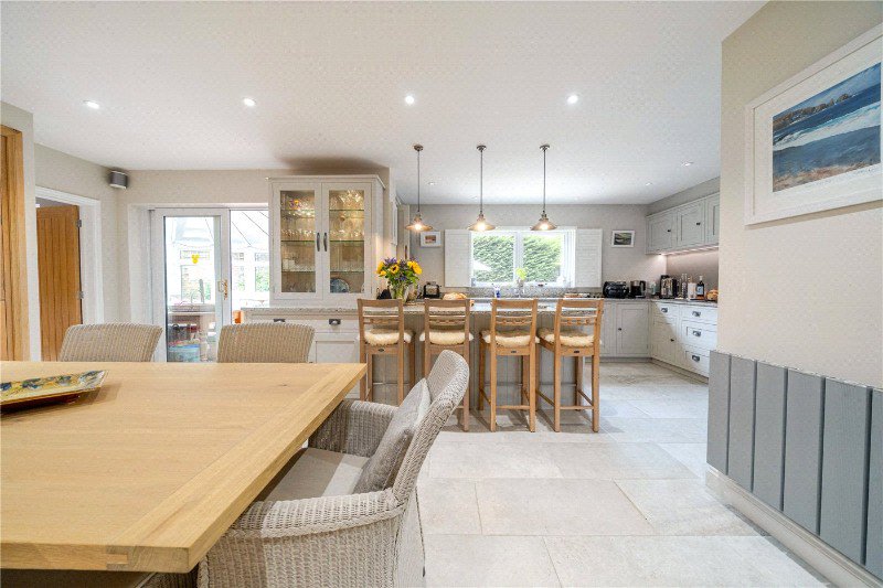 From the moment you step into the grand entrance hall, you are greeted by a striking sense of space, enhanced by oak flooring and a sweeping galleried staircase. At the heart of the home lies the bespoke kitchen – a culinary masterpiece featuring sleek worktops from Landford Stone, a central breakfast bar, premium integrated appliances, and underfloor heating. A matching utility room and a practical boot room ensure both style and function.