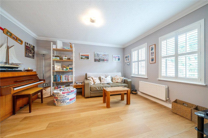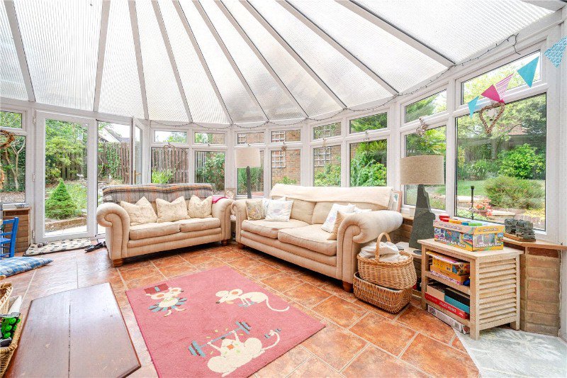 The principal reception rooms offer a wealth of versatility. The dual-aspect living room, extending over 28 feet, is centred around a feature fireplace, creating the perfect setting for both family gatherings and elegant entertaining. A generous conservatory opens onto the gardens, flooding the space with natural light and offering panoramic views. A second reception room provides further flexibility, ideal as a study, playroom, or snug, while a cloakroom completes the ground floor.