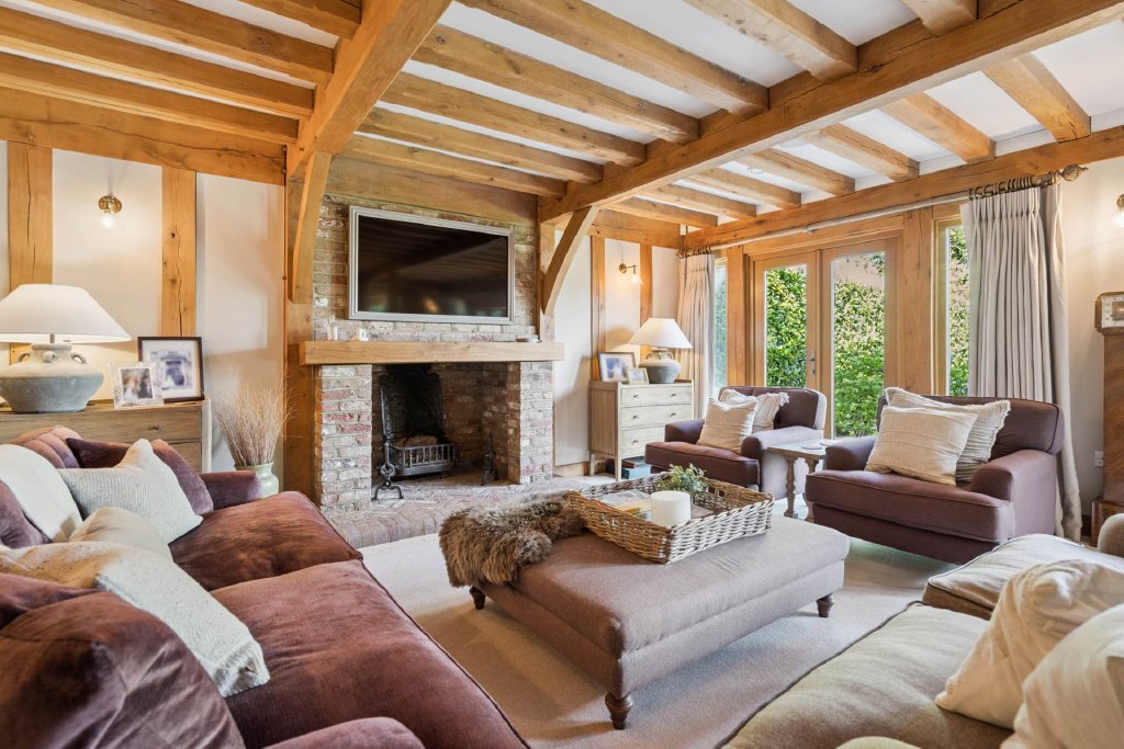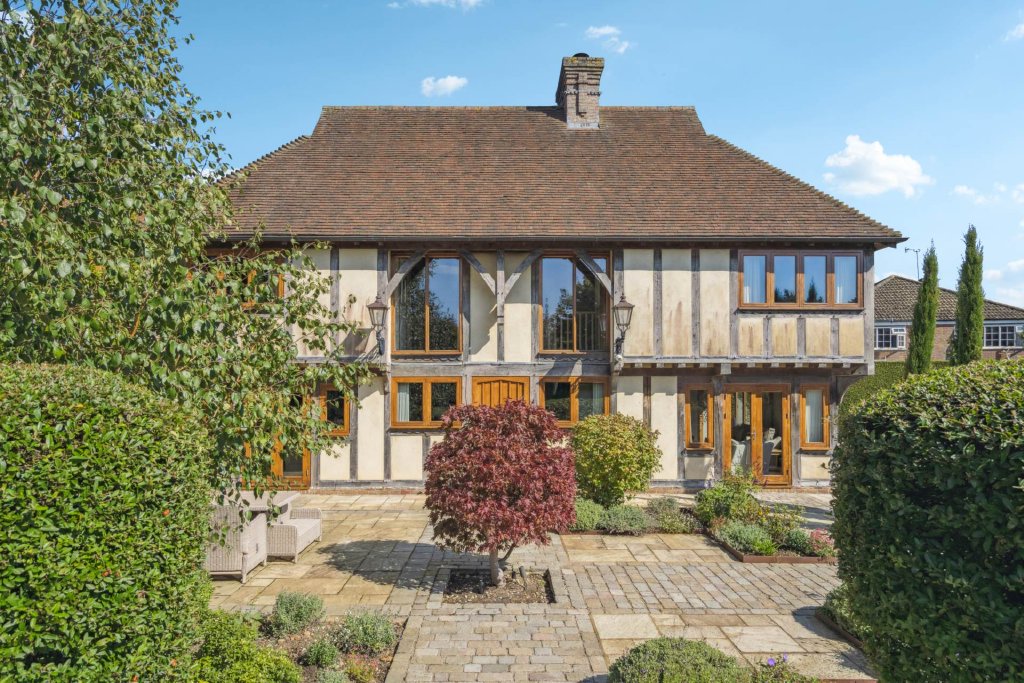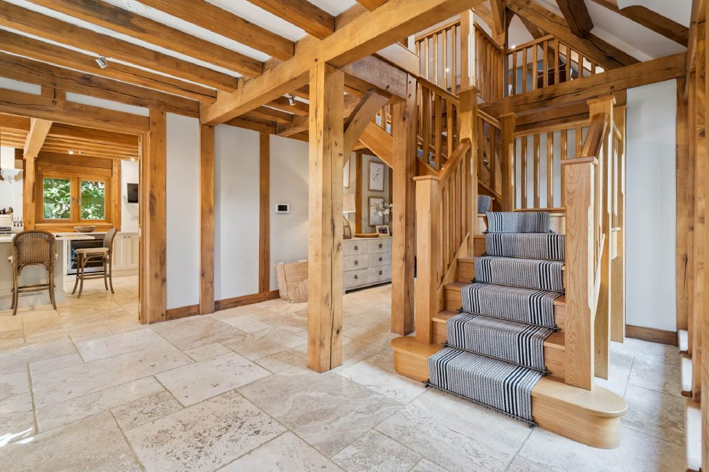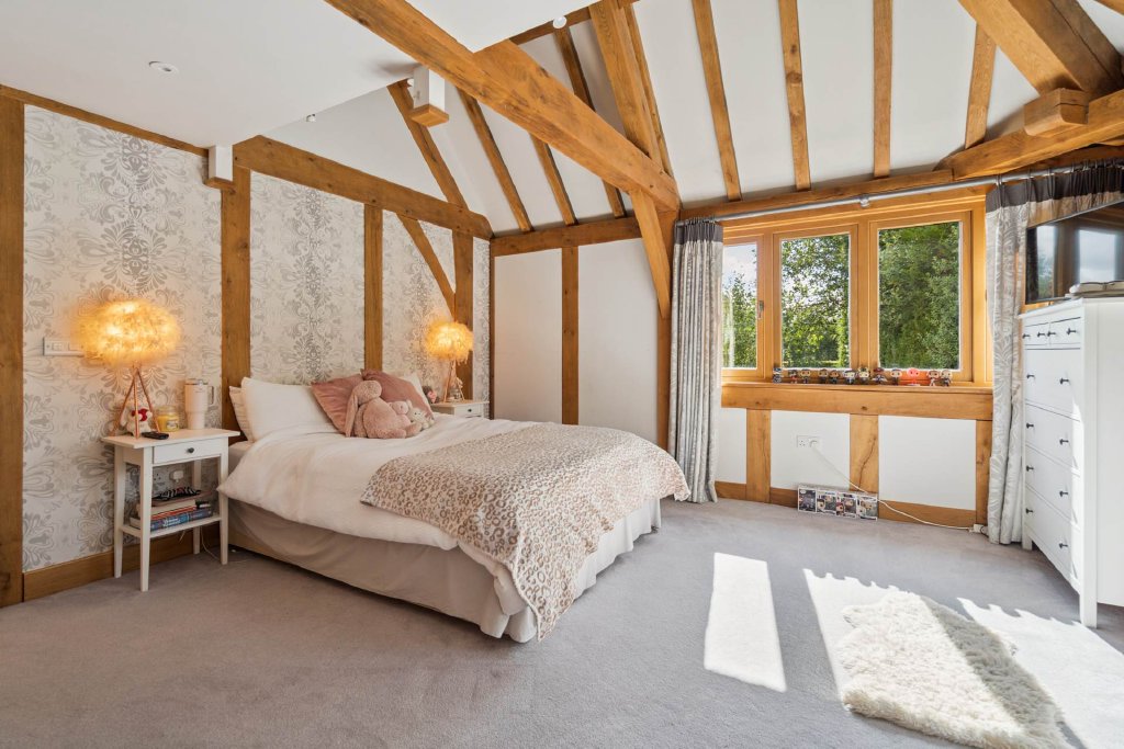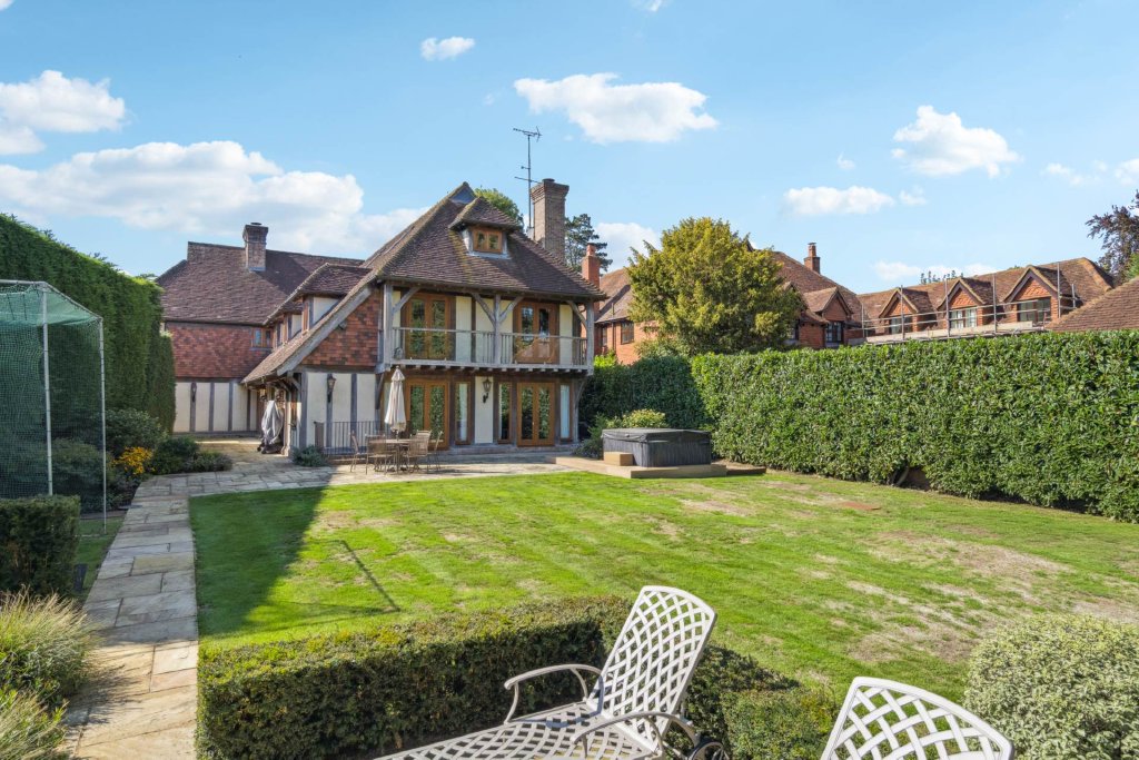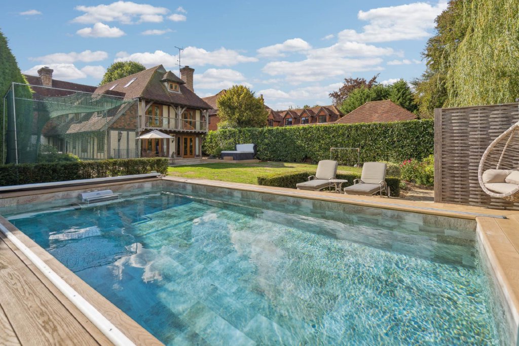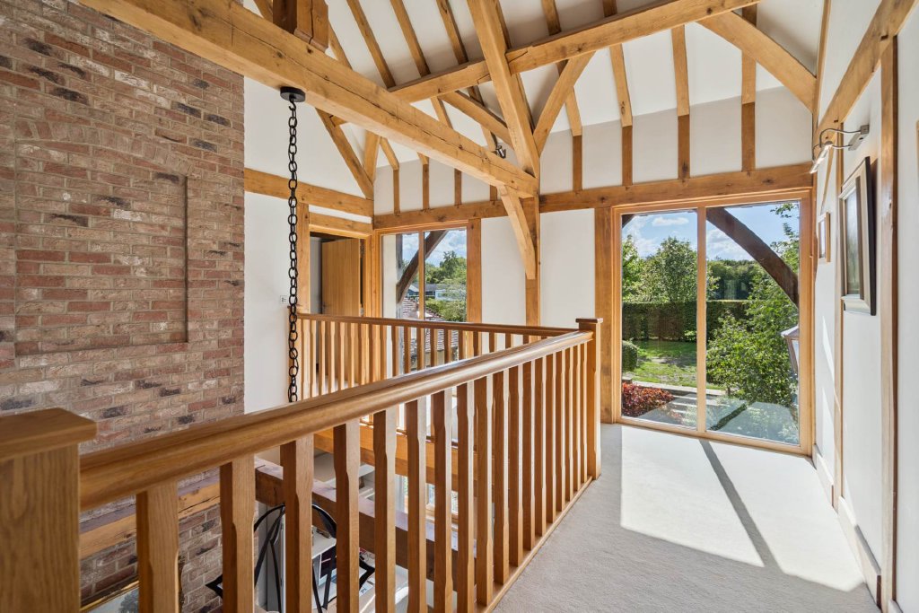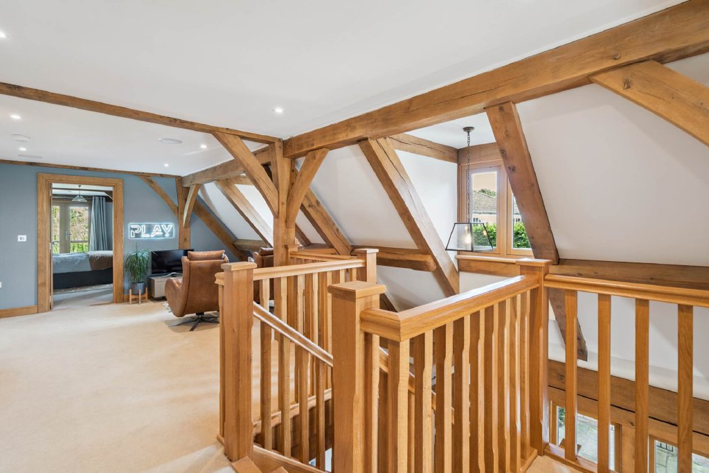 Built in 2006, this stunning home combines traditional charm with modern family living and as the name suggests, is built around a beautiful, solid oak frame resulting in a traditional character feel with all the modern conveniences one would expect. Upon entering you are greeted by a spacious reception hall with vaulted ceiling, exposed beams, and open fireplace,which doubles as a stylish dining room. The kitchen/breakfast room is a real showstopper, designed by Nicholas James with a striking island and banquette seating area to one end. There are two main reception rooms; a large sitting room for more formal occasions, and a smaller cosy snug. Both have open fires and lovely views over the gardens. The ground floor also features a cloakroom, walk-in coat cupboard, and a practical utility/boot room. Upstairs the bright, galleried landing provides access to four bedrooms and a family bathroom. The principal bedroom suite is dual aspect with ensuite bathroom and a mezzanine-level dressing room. There is a double bedroom with an ensuite bathroom and its` own mezzanine level. Two more double bedrooms, one with its own ensuite, share access to a covered balcony overlooking the garden. The second floor offers what could be used as a self-contained annexe with a sitting room with kitchenette, double bedroom, and ensuite, perfect for an au pair, teenager, or as a home office. Downstairs, the lower ground floor has a utility room, plant room, and a recently updated cinema/games room. Outside the plot extends to almost 0.5 acres with two ample areas of lawn, one accessed off the drawing room with patio, BBQ area, endless swimming pool and hot tub. The gated driveway offers plenty of parking and leads to a garage and a covered double carport with log store.