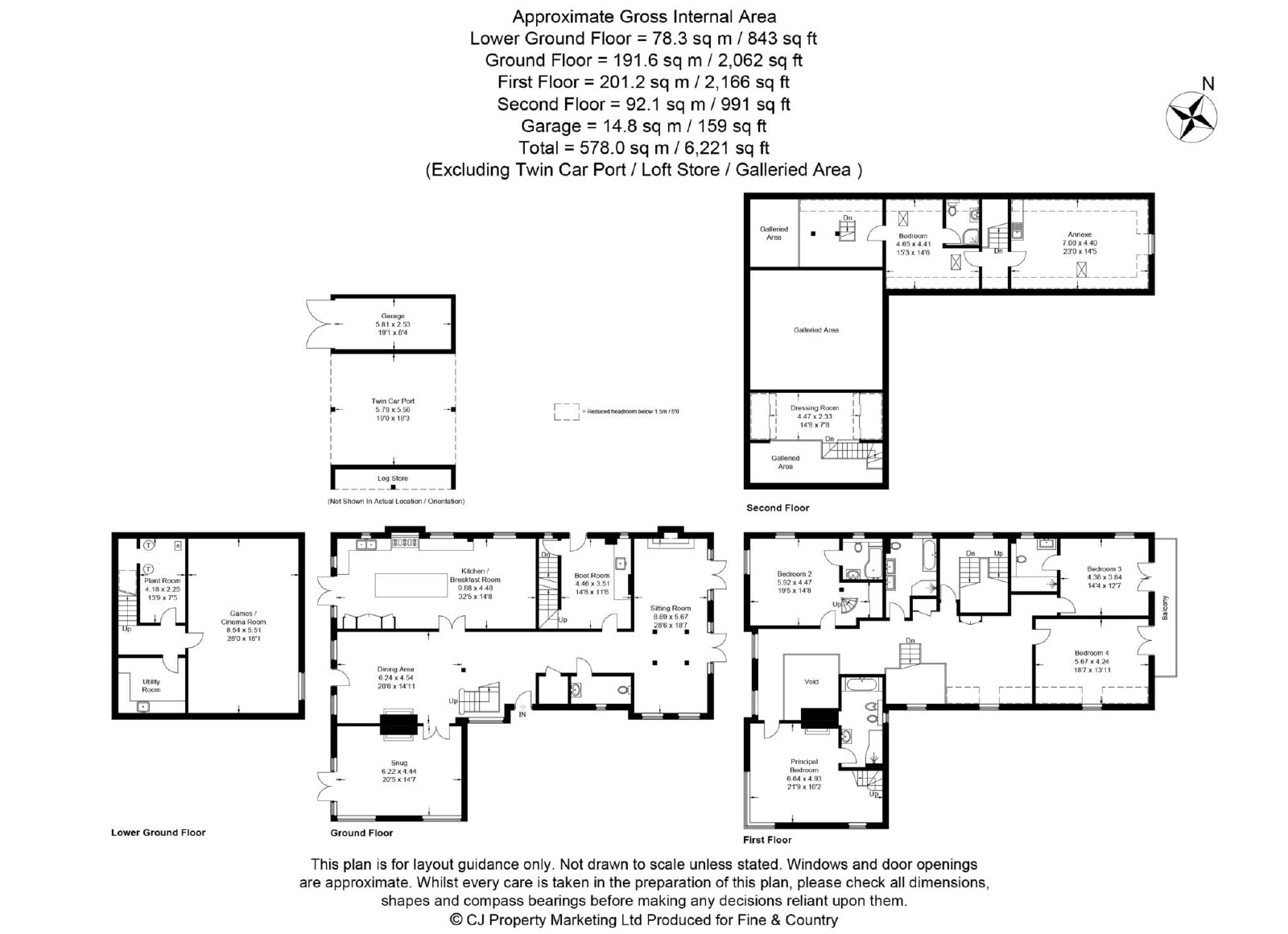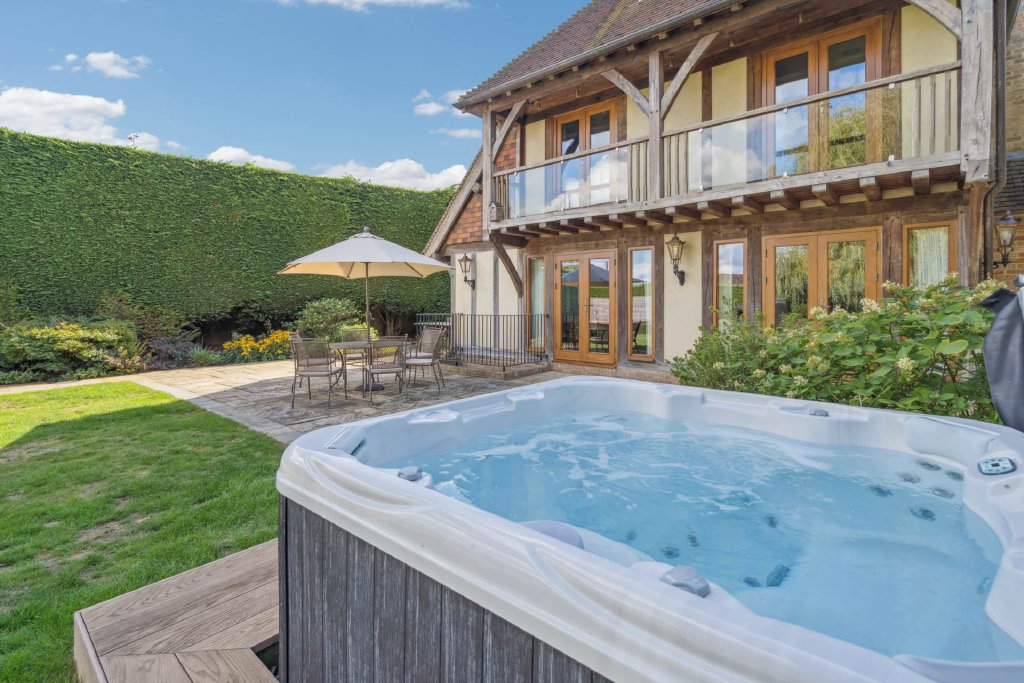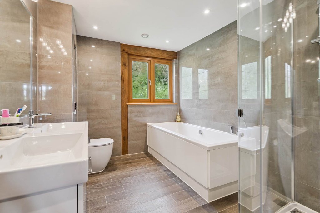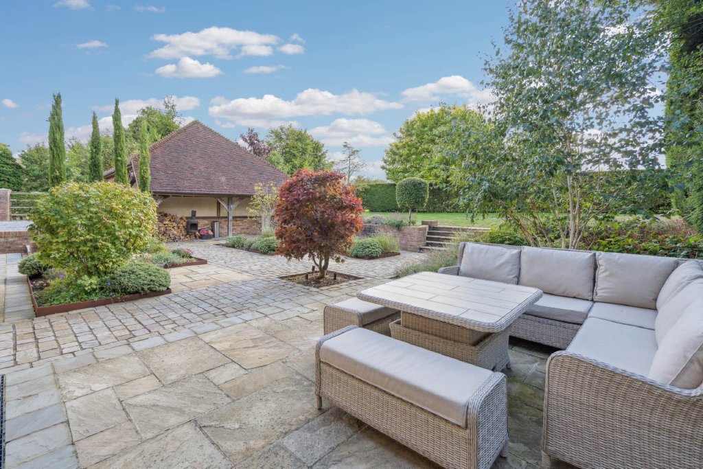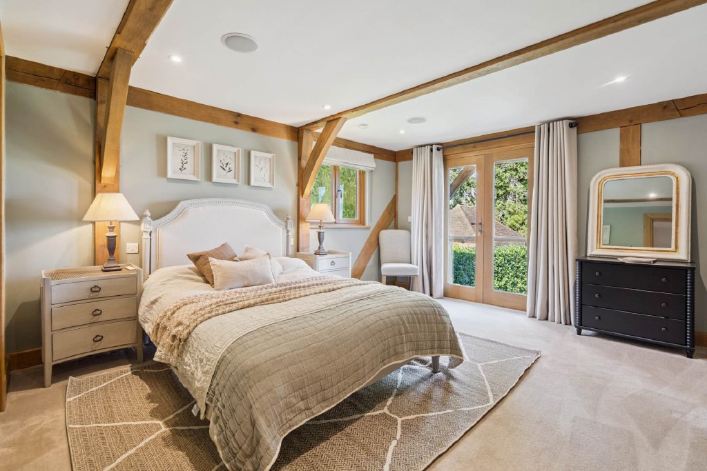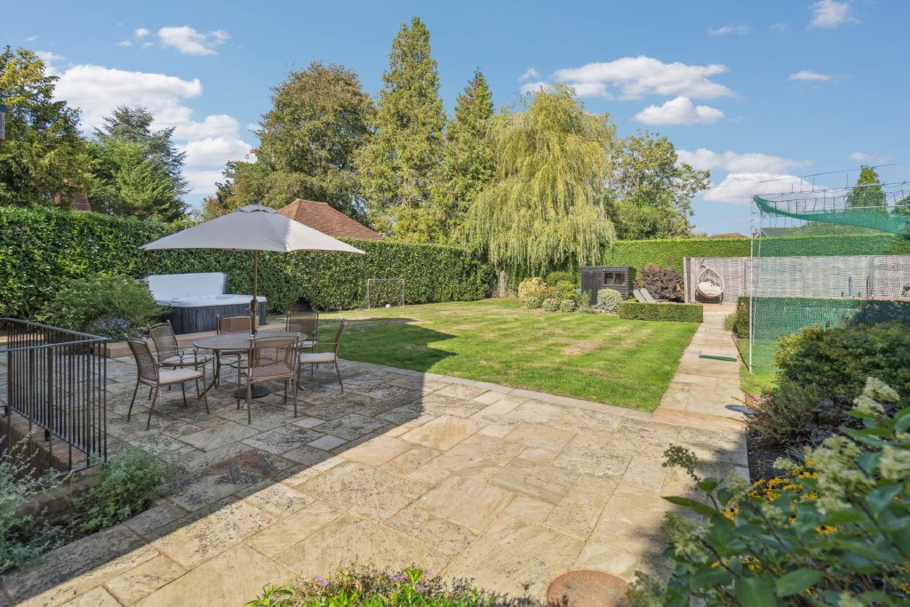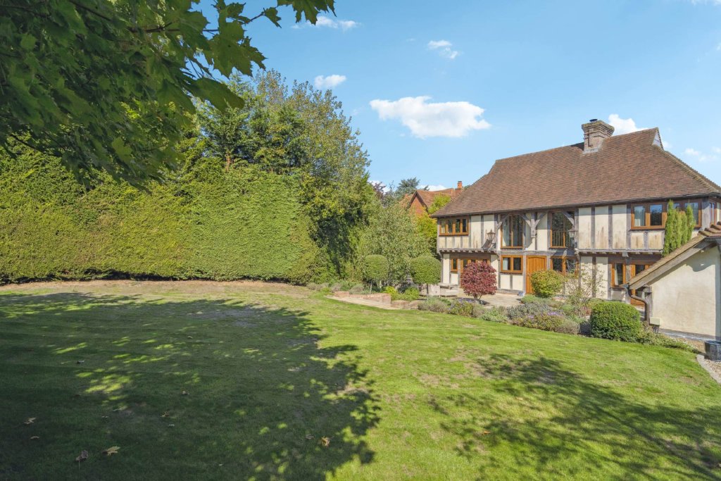 Built in 2006, this stunning home combines traditional charm with modern family living and as the name suggests, is built around a beautiful, solid oak frame resulting in a traditional character feel with all the modern conveniences one would expect. Upon entering you are greeted by a spacious reception hall with vaulted ceiling, exposed beams, and open fireplace,which doubles as a stylish dining room. The kitchen/breakfast room is a real showstopper, designed by Nicholas James with a striking island and banquette seating area to one end. There are two main reception rooms; a large sitting room for more formal occasions, and a smaller cosy snug. Both have open fires and lovely views over the gardens. The ground floor also features a cloakroom, walk-in coat cupboard, and a practical utility/boot room. Upstairs the bright, galleried landing provides access to four bedrooms and a family bathroom. The principal bedroom suite is dual aspect with ensuite bathroom and a mezzanine-level dressing room. There is a double bedroom with an ensuite bathroom and its` own mezzanine level. Two more double bedrooms, one with its own ensuite, share access to a covered balcony overlooking the garden. The second floor offers what could be used as a self-contained annexe with a sitting room with kitchenette, double bedroom, and ensuite, perfect for an au pair, teenager, or as a home office. Downstairs, the lower ground floor has a utility room, plant room, and a recently updated cinema/games room. Outside the plot extends to almost 0.5 acres with two ample areas of lawn, one accessed off the drawing room with patio, BBQ area, endless swimming pool and hot tub. The gated driveway offers plenty of parking and leads to a garage and a covered double carport with log store.