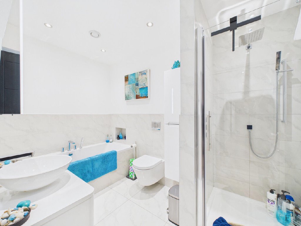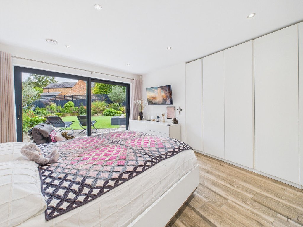 The bedroom wing is arranged along an inner hallway. The principal suite features sliding patio doors opening onto the terrace, offering excellent views of the landscaped garden, along with fitted wardrobes and a private ensuite. The remaining two bedrooms are both doubles, each with fitted wardrobes, and enjoy views over the garden. They are served by a well-appointed family bathroom with both a bath and separate shower.