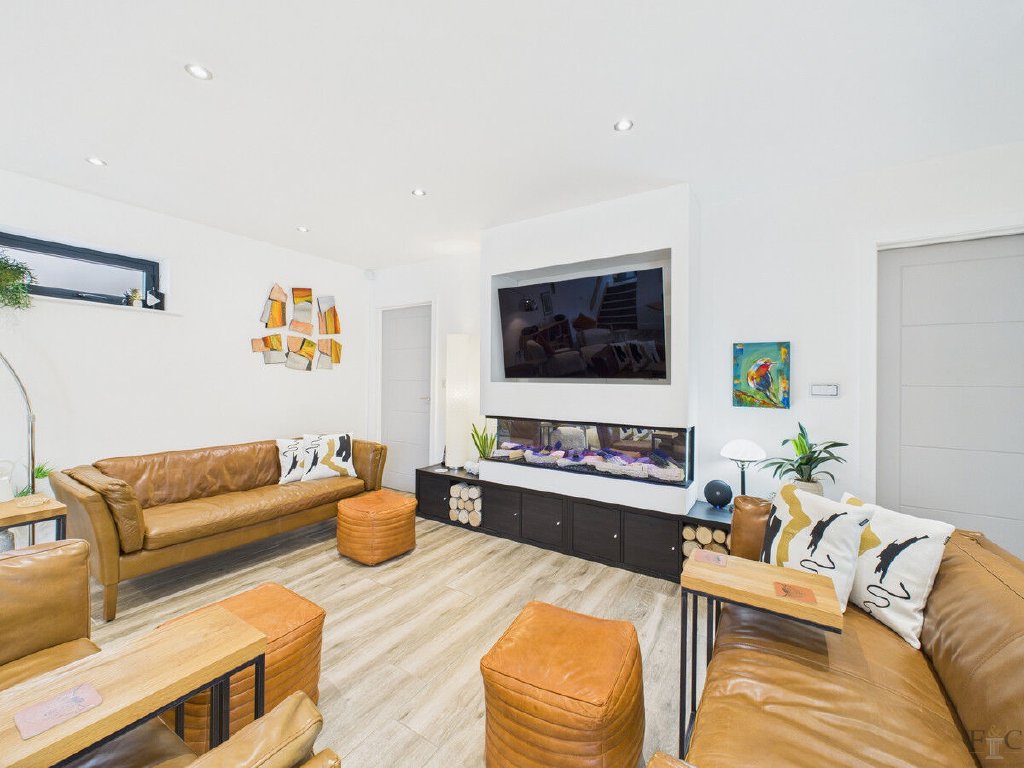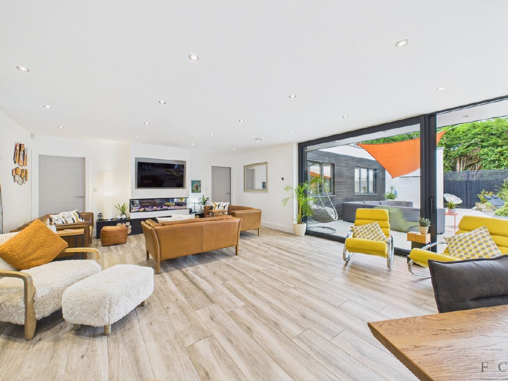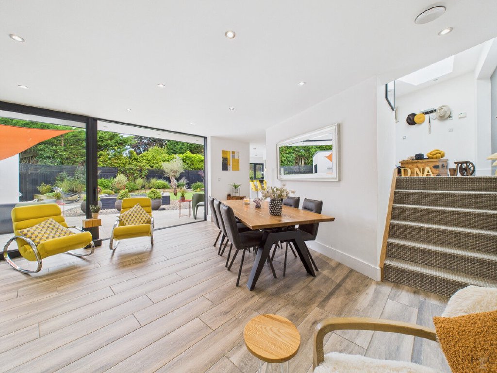 At the heart of the home is a striking open plan lounge and dining area. The lounge is centred around a contemporary electric fire, while a large sliding glass door positioned centrally in the room provides direct access to the garden. The layout encourages relaxed family living and entertaining. The adjacent breakfast kitchen is a sociable space, featuring a central island with breakfast bar, Quartz worktops, recently installed contrasting glass splashbacks, a Quooker boiling tap, a walk-in pantry, and integrated appliances including induction hob, extractor, double oven, wine cooler, and dishwasher. A utility room is accessed from the living area.