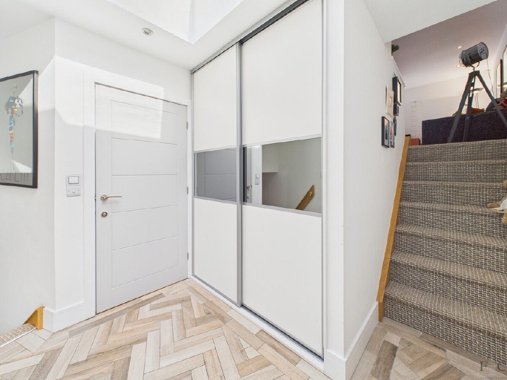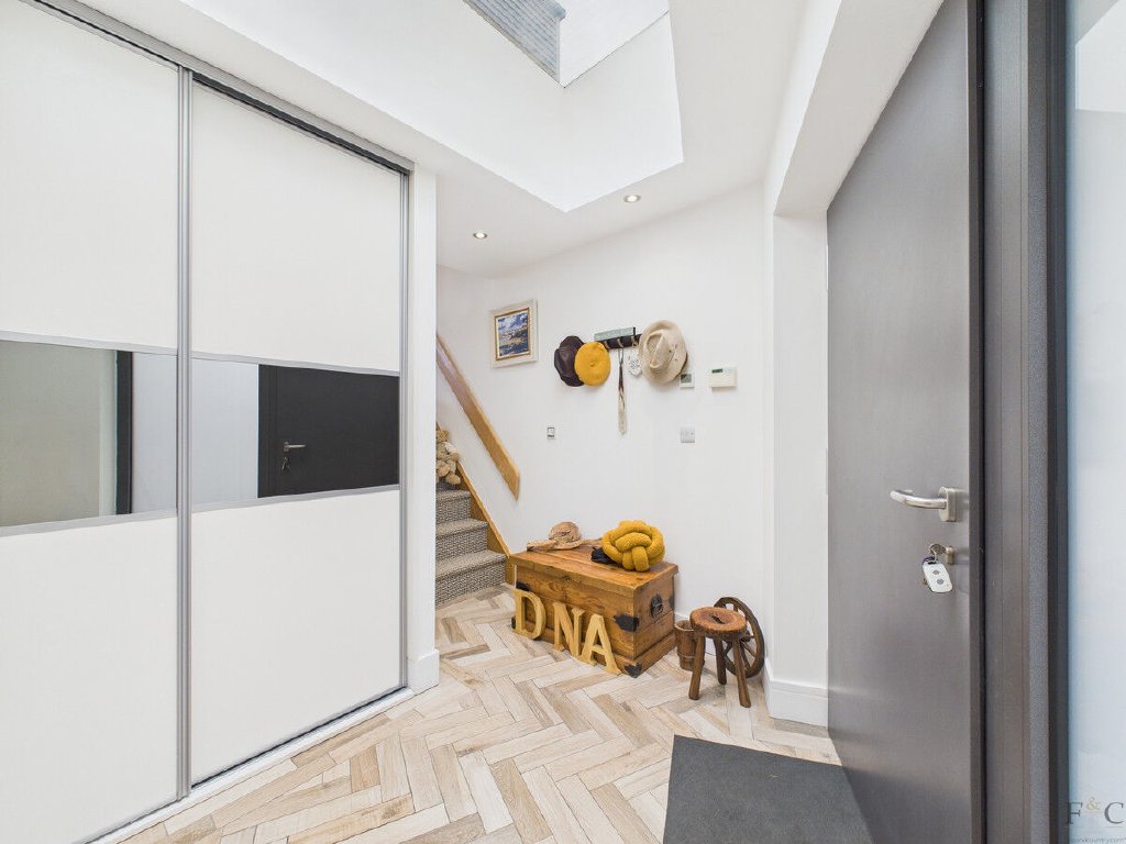 The property is entered via a welcoming entrance hall, which includes a cloakroom/WC and a storage cupboard. Stairs rise to a versatile first-floor reception room, originally designed as a fourth bedroom. This adaptable space could serve as a formal reception, occasional guest bedroom, or home office. A corner window fills the room with light and frames striking views over the professionally landscaped gardens, making it a bright and visually appealing feature.