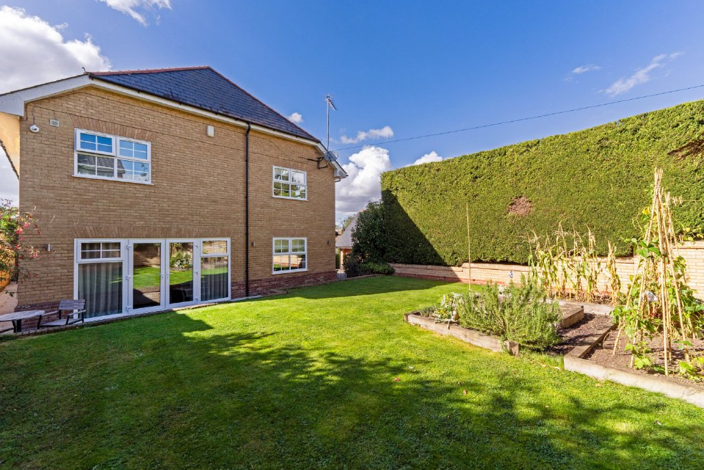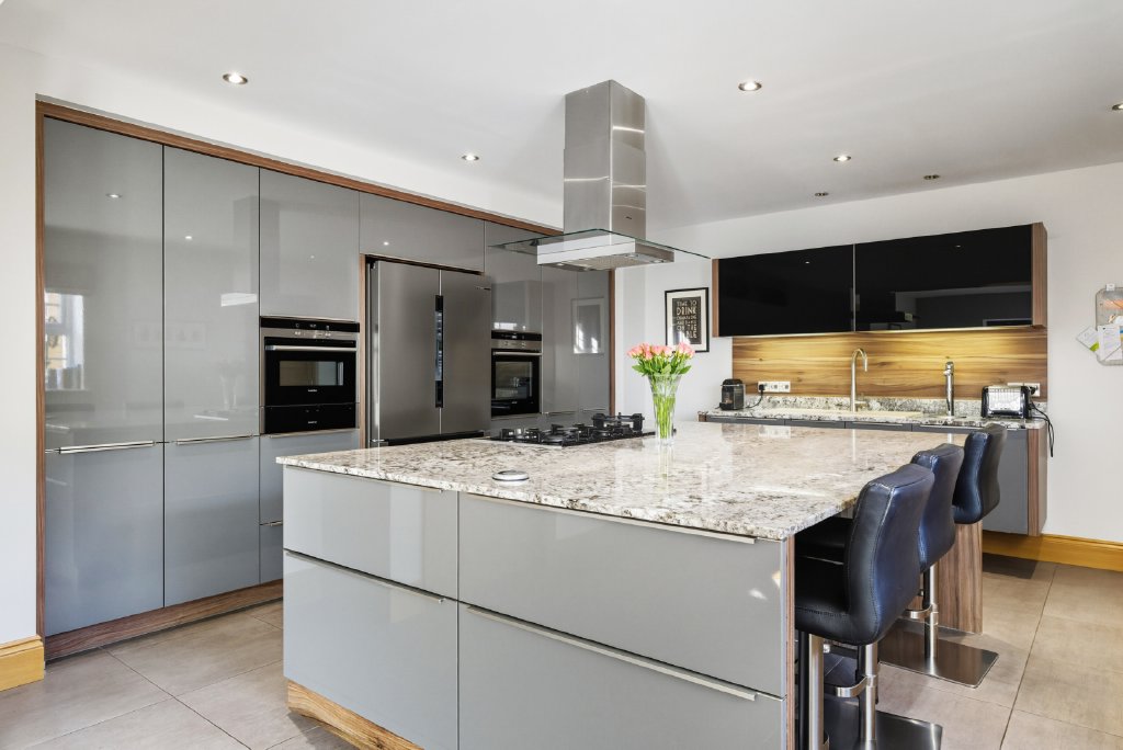 The stunning kitchen/breakfast room has been beautifully fitted with bespoke wall and base units, integrated appliances, and a large central island with breakfast bar, all finished with elegant granite worksurfaces. A separate utility/boot room with external access offers additional practicality. The breakfast area itself enjoys a front-facing aspect and French doors leading to a fabulous outdoor entertaining space, with a pathway providing access to the lawned garden on the opposite side of the property.