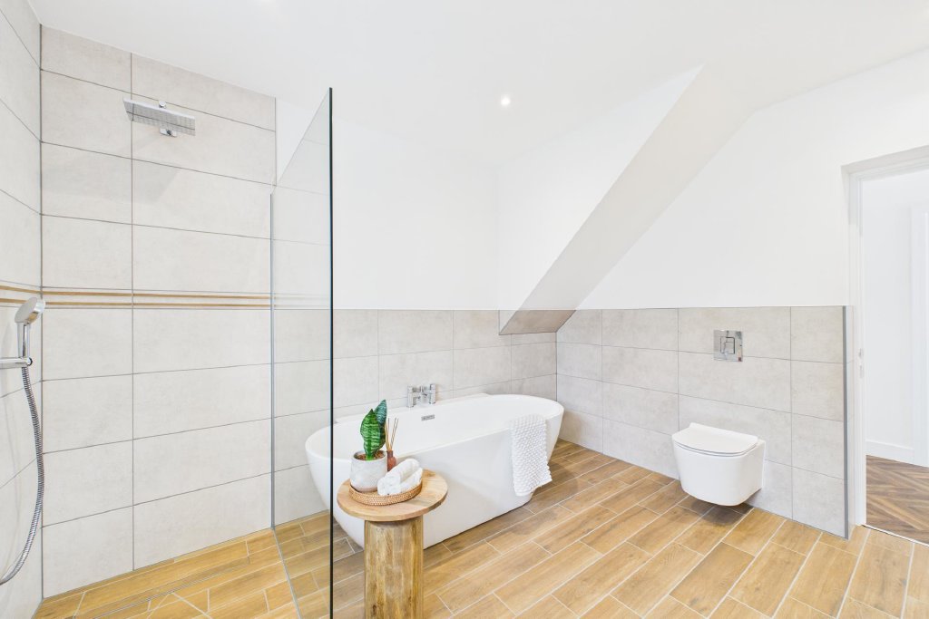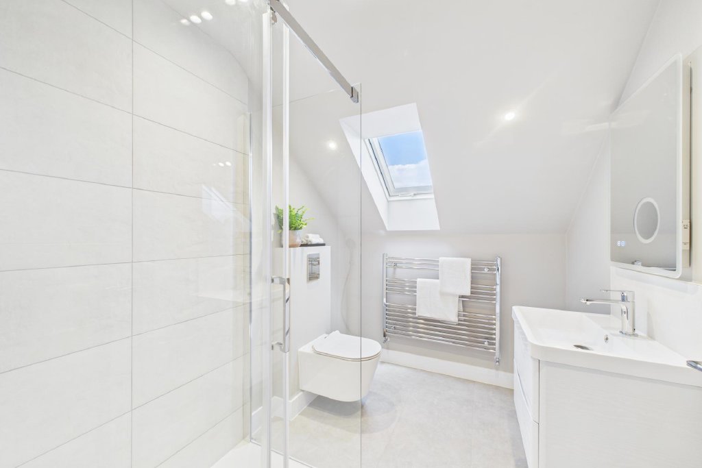ENSUITE SHOWER ROOM Tiled shower cubicle with glass screens and sliding glass door. Incorporating thermostatically controlled plumbed in shower unit with overhead shower and handheld shower attachment; floating vanity wash basin with Bluetooth connected illuminated mirror over and floating WC. Sloping ceiling; Chrome heated towel rail; ceramic tile floor; Velux window; ceramic tiled floor.